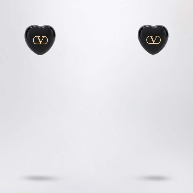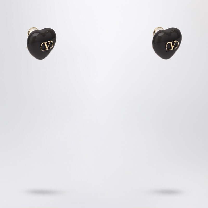 Valentino Garavani earrings in metal and black enamel, characterized by a puffed heart shape, Vlogo Signature in gold metal and clip closure.