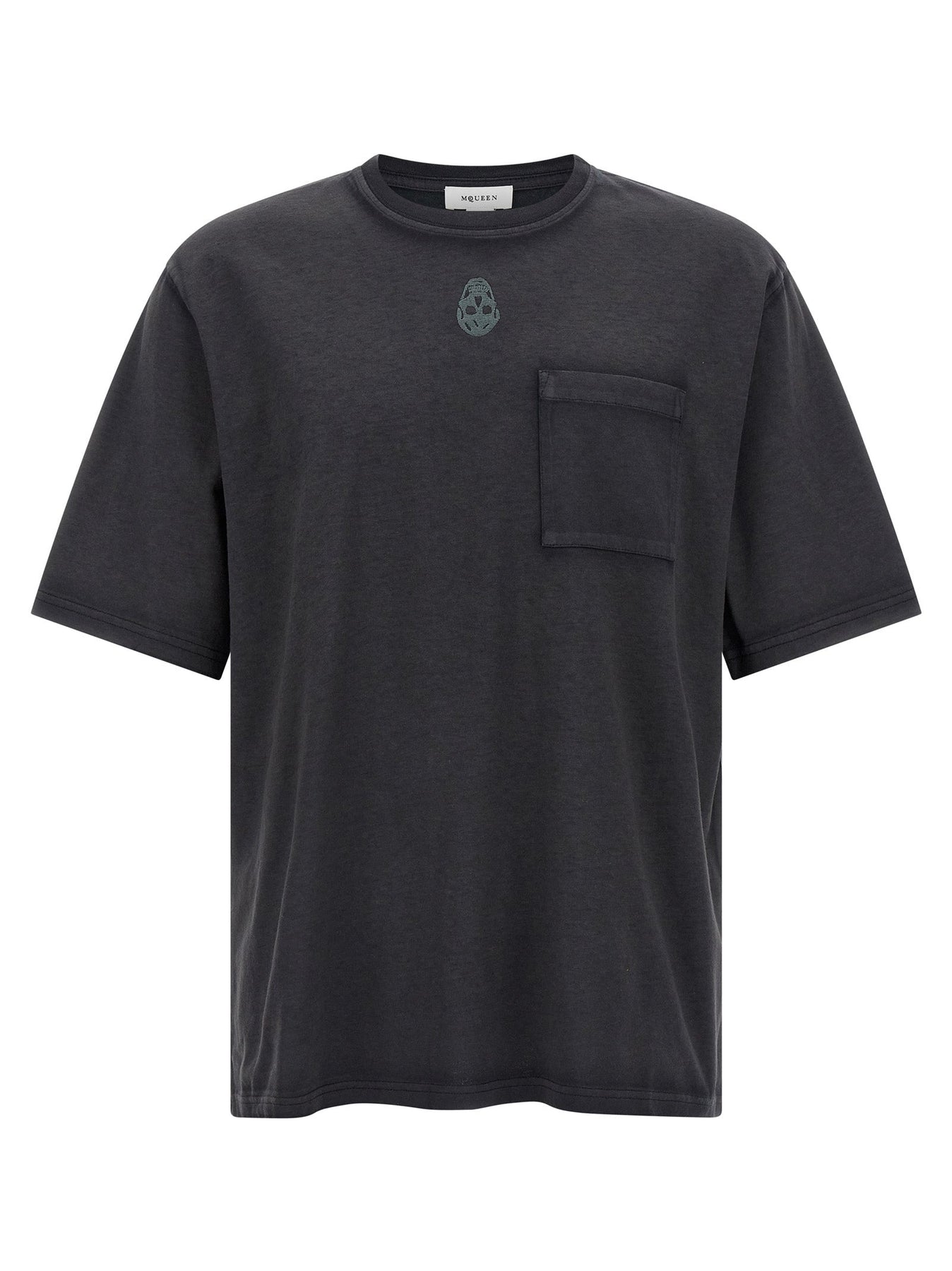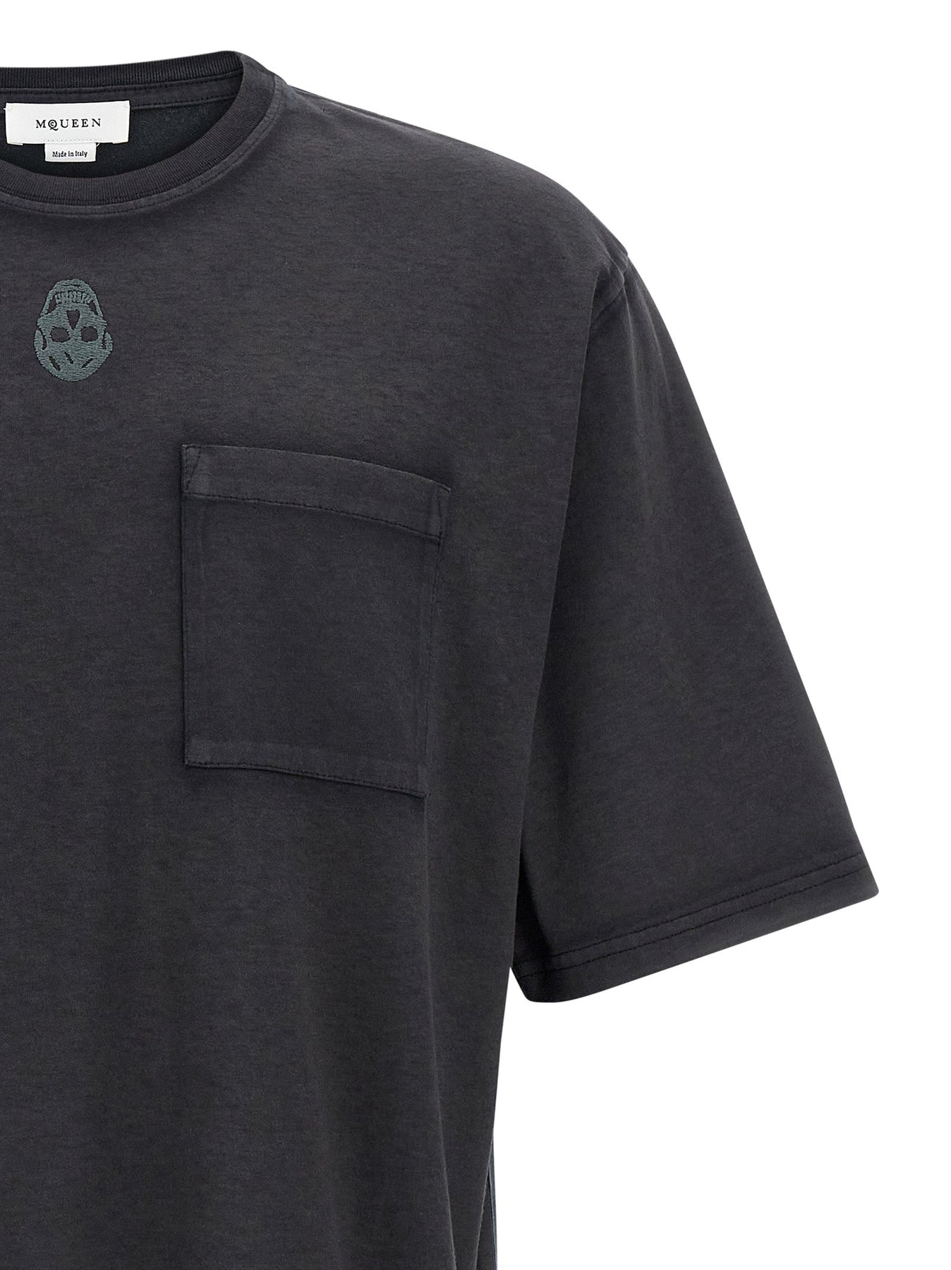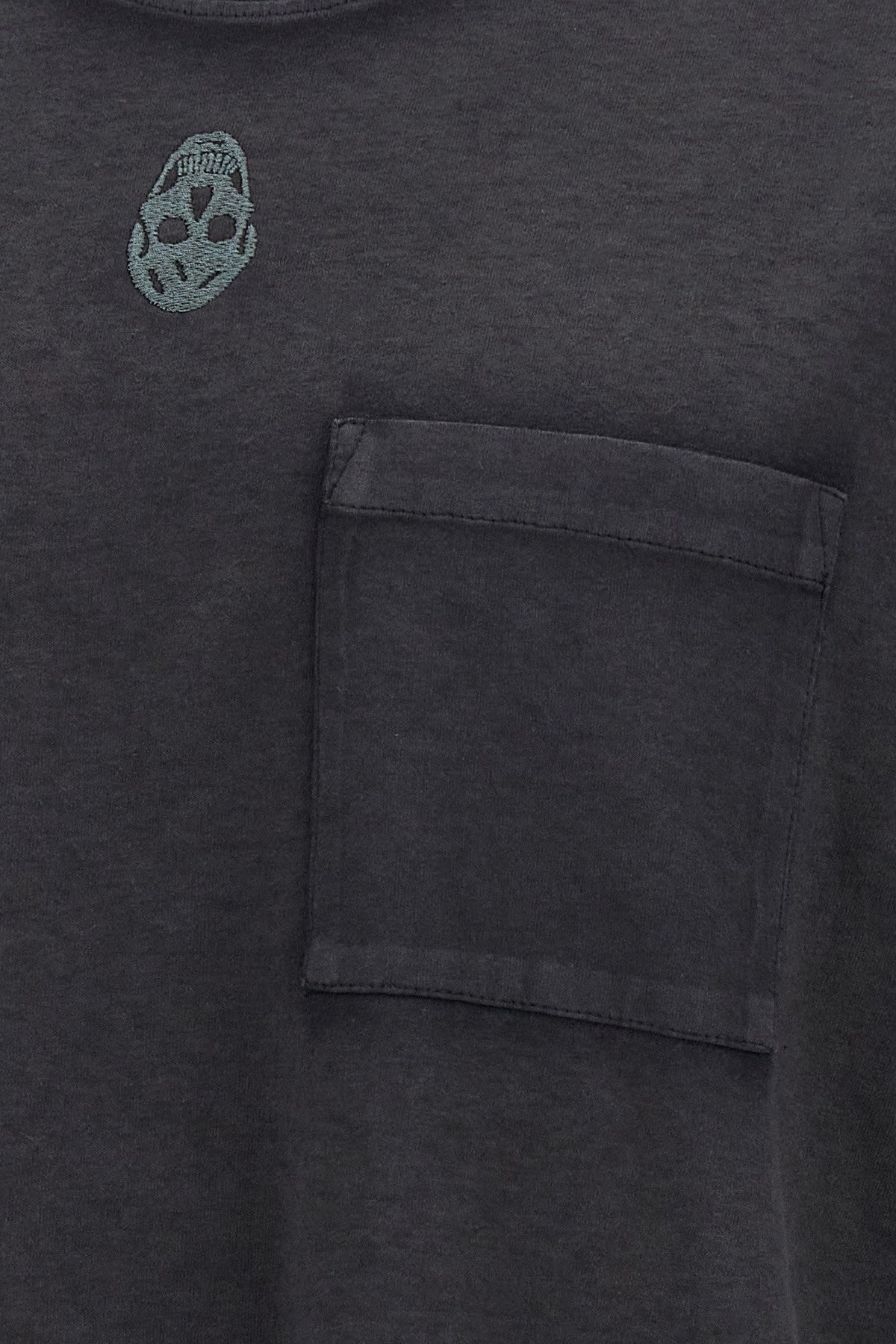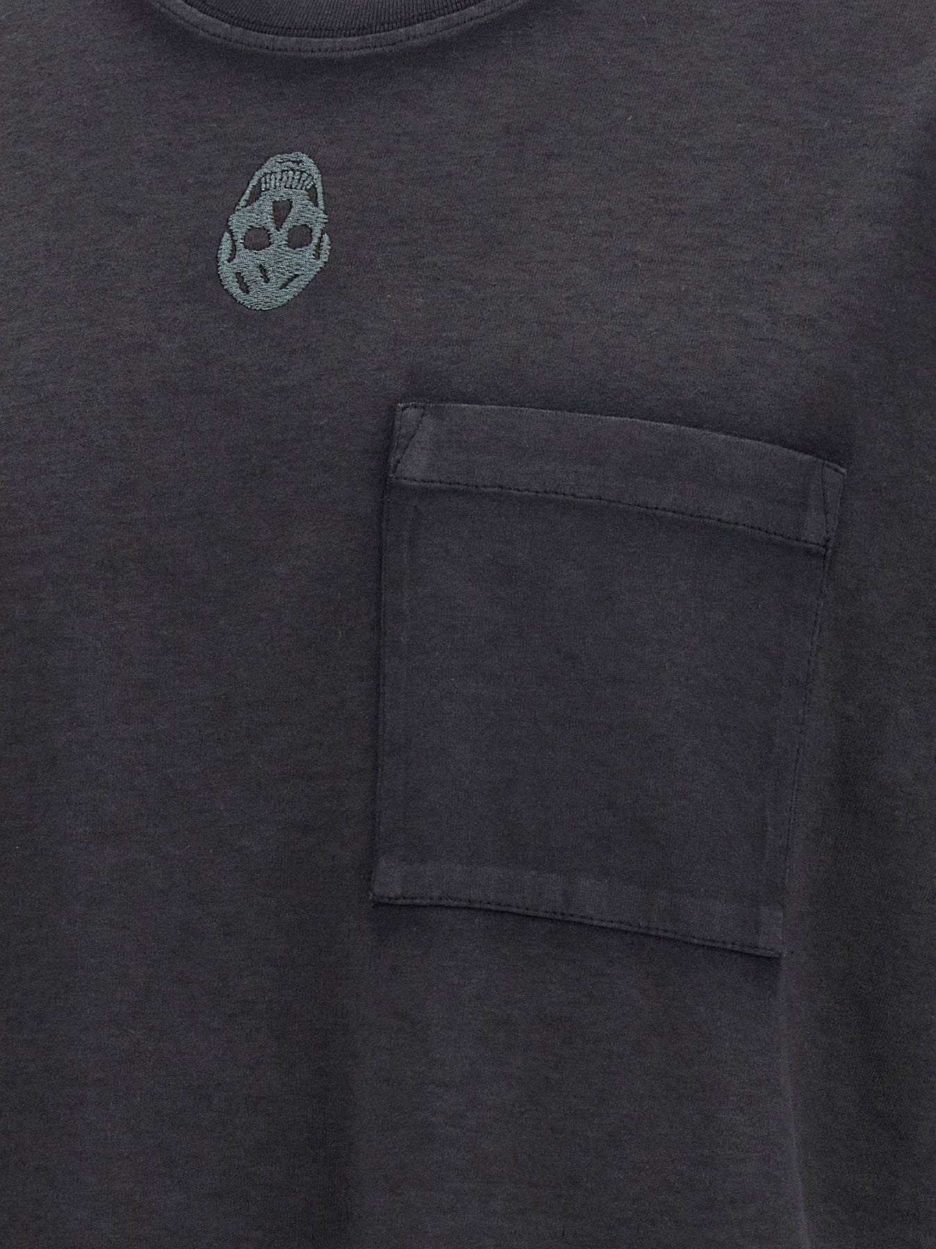 Bleached overdyed cotton jersey T-shirt, front 'Skull' embroidery, breast pocket, crew neck, short sleeves with dropped shoulders.