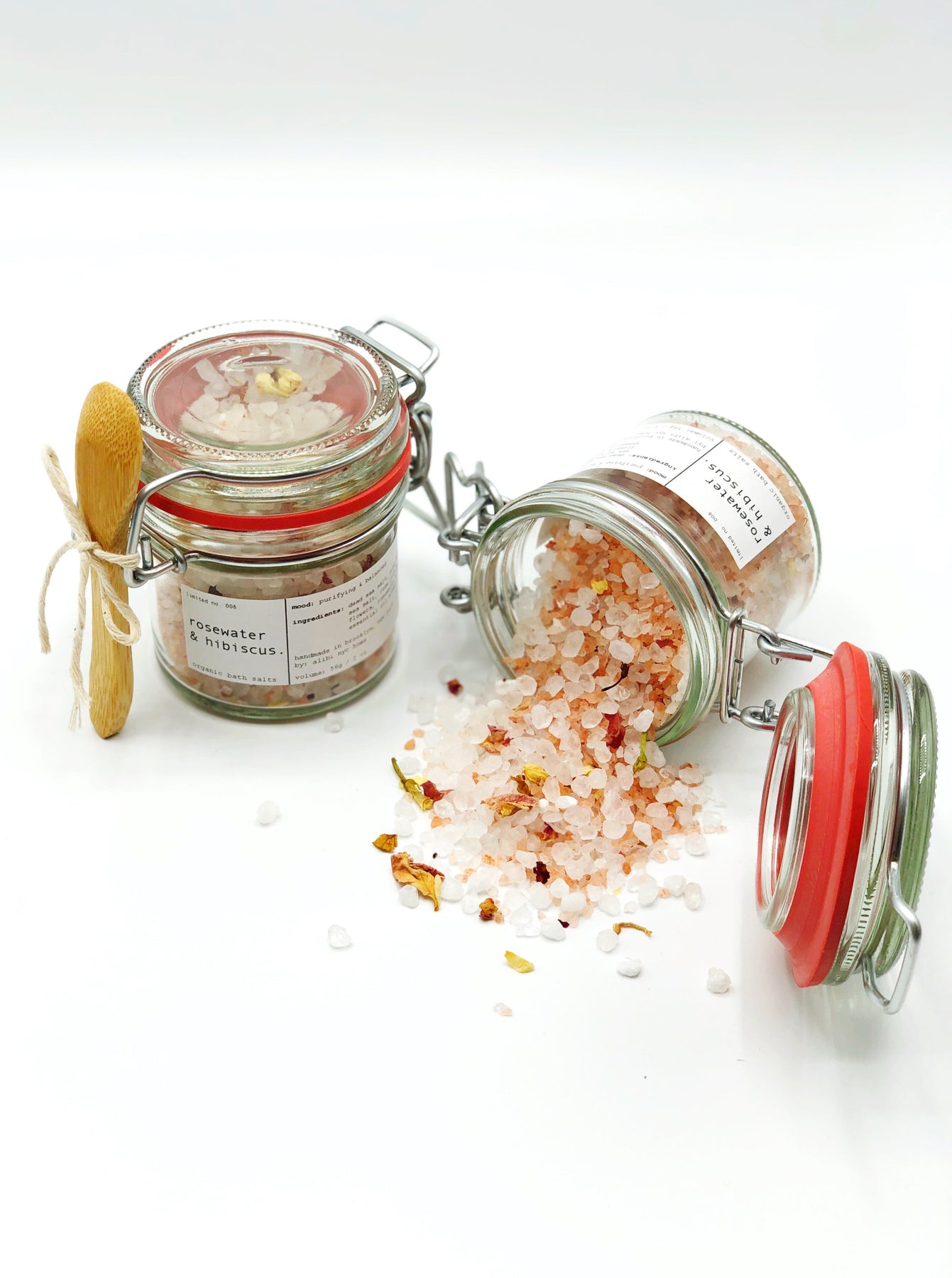 Our Rose Water & hibiscus bath salt is made with a mix of dead sea salt and pink sea salt, which are both known for their skin-loving properties. Mixed with pink rose petals and jasmine flowers for an elegant appearance.