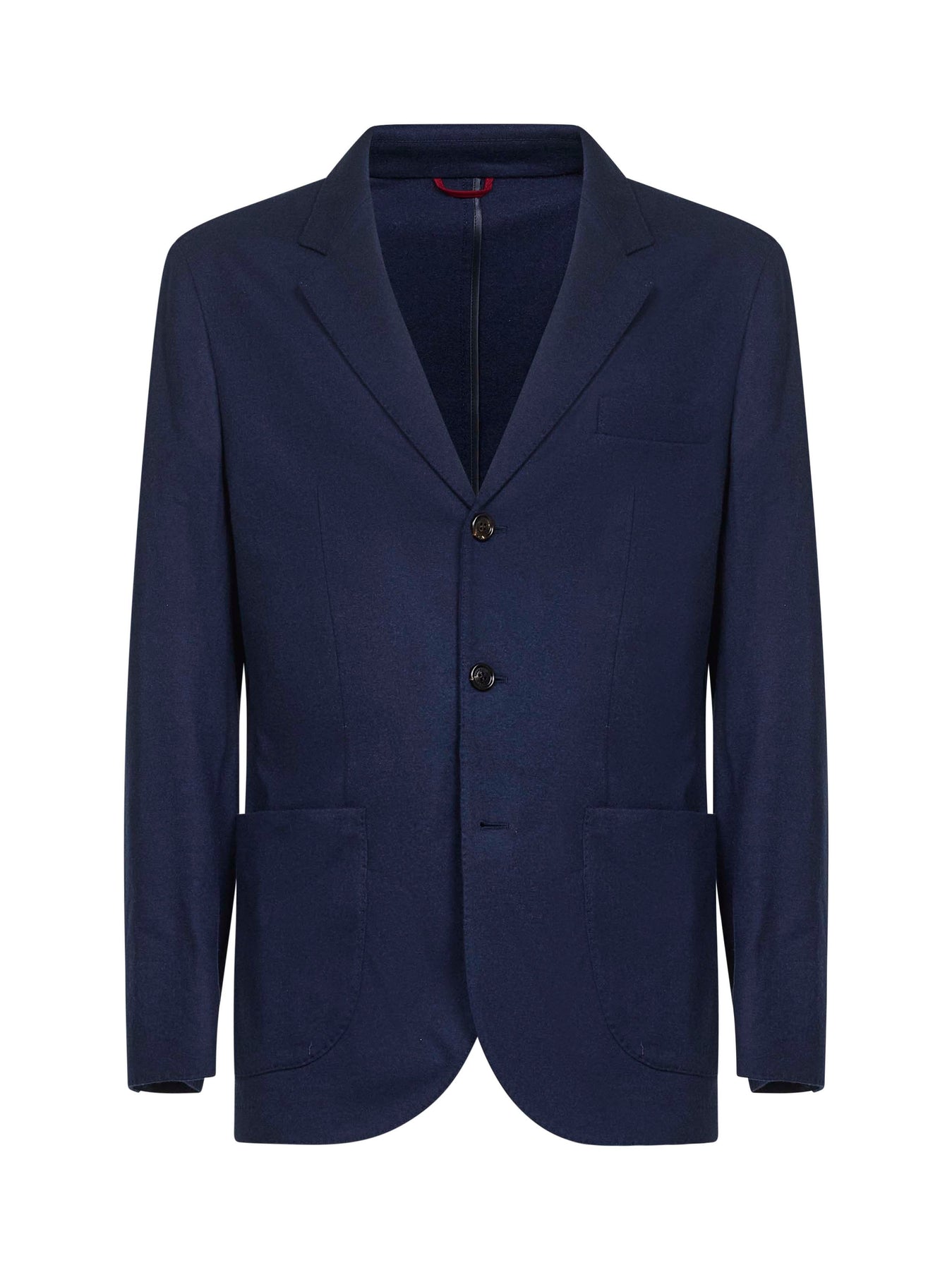 •Single-breasted three-button placket •Classic lapel •Long sleeves, four-button cuffs •Front patch pockets, chest pocket, inner pockets •Side slits at back •Unlined •Drop 7; tapered through the chest with slightly pronounced shoulders fit •Blue color •100% Cashmere •Made in Italy