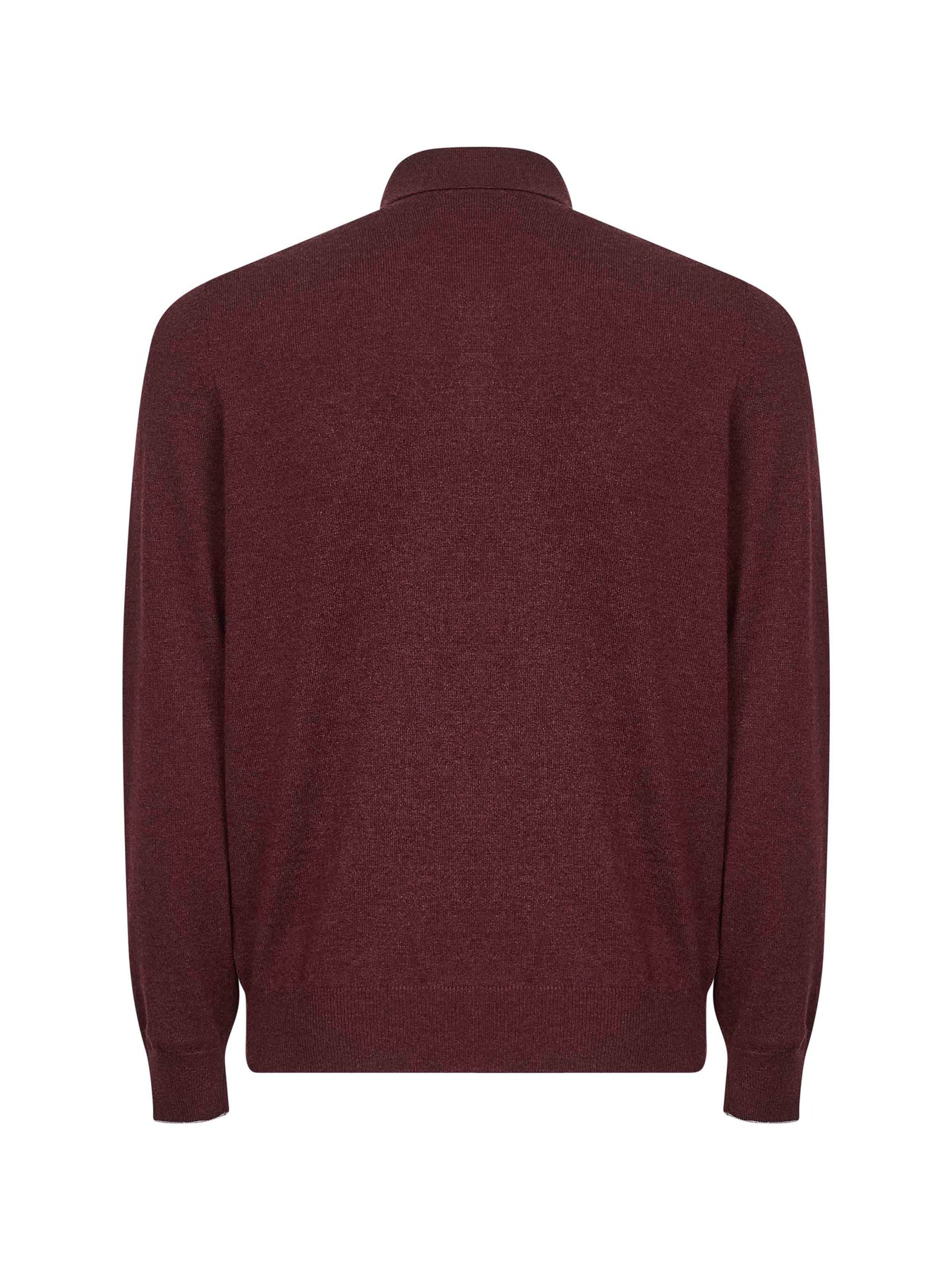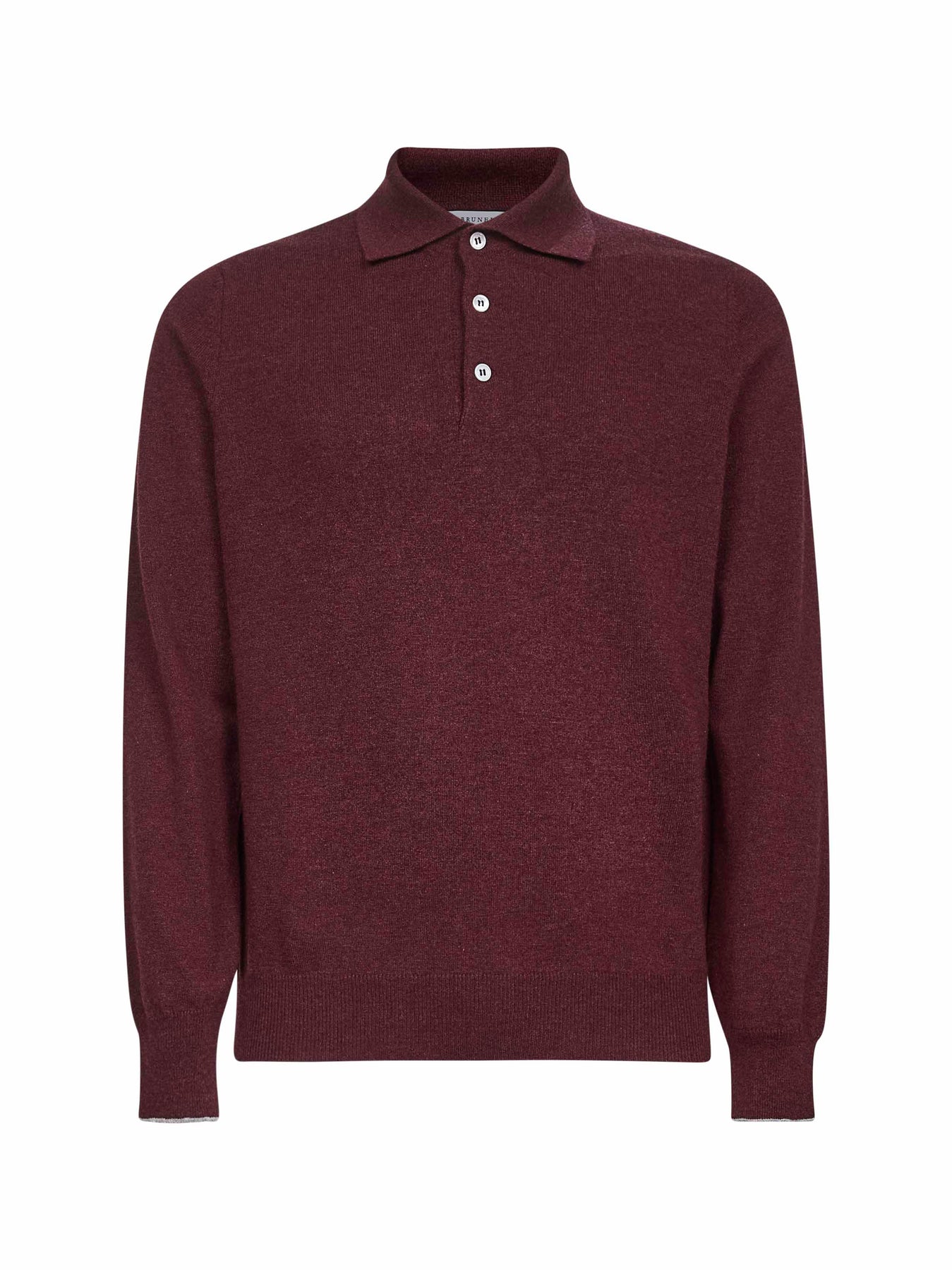 •Front three-button placket •Ribbed polo collar •Long sleeves, contrasting edge at cuffs •Ribbed cuffs and bottom band •Plain stitch knit •Regular fit •Burgundy color •100% Cashmere •Made in Italy