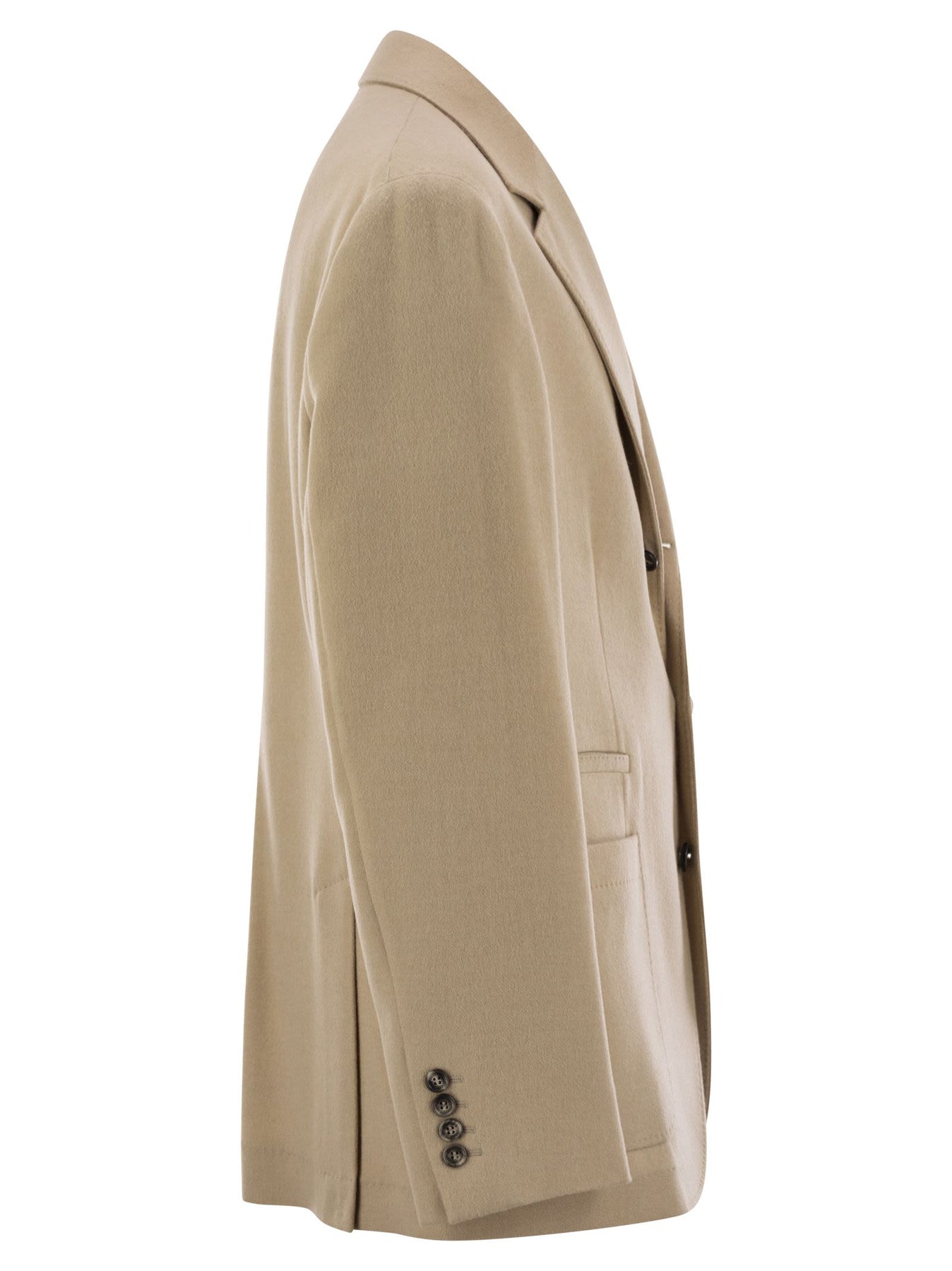 Fine materials and modern attitude meet in the new camel jacket with patch pockets. The smooth, soft and enveloping appearance of the garment is the result of the fine qualities of natural fibres. The unlined construction combines lightness and comfort with the classic fit that distinguishes the Brunello Cucinelli style: fitted at the bust with shoulders slightly highlighted to emphasise the masculine physique. - Three-button closure with two ironed horn buttons - Patch pockets and breast pocket - Double back slit DESIGNER ID: MY4017BND C002 100% Camel Lining: 100% Cupro