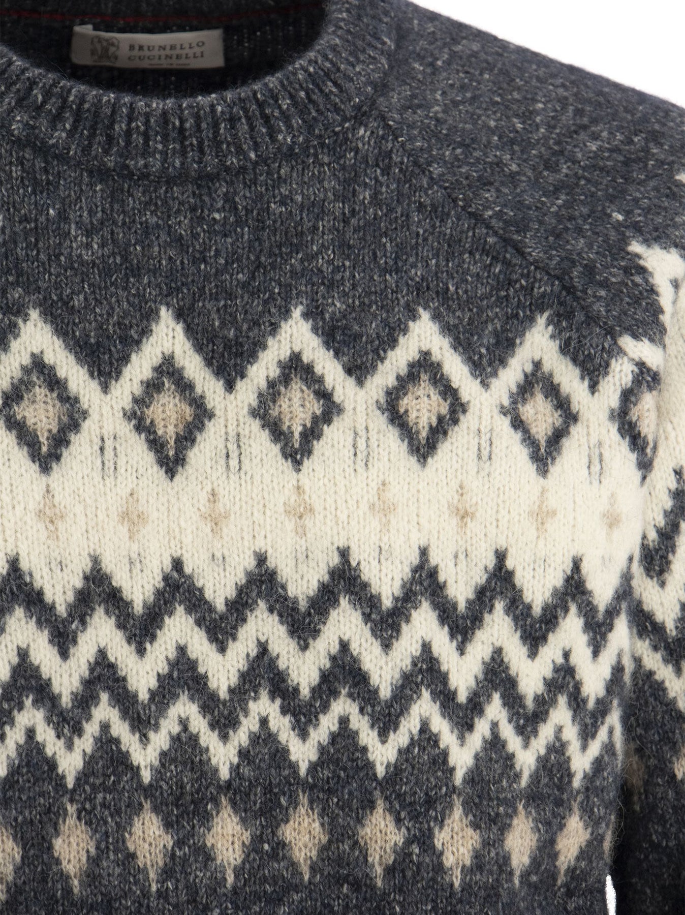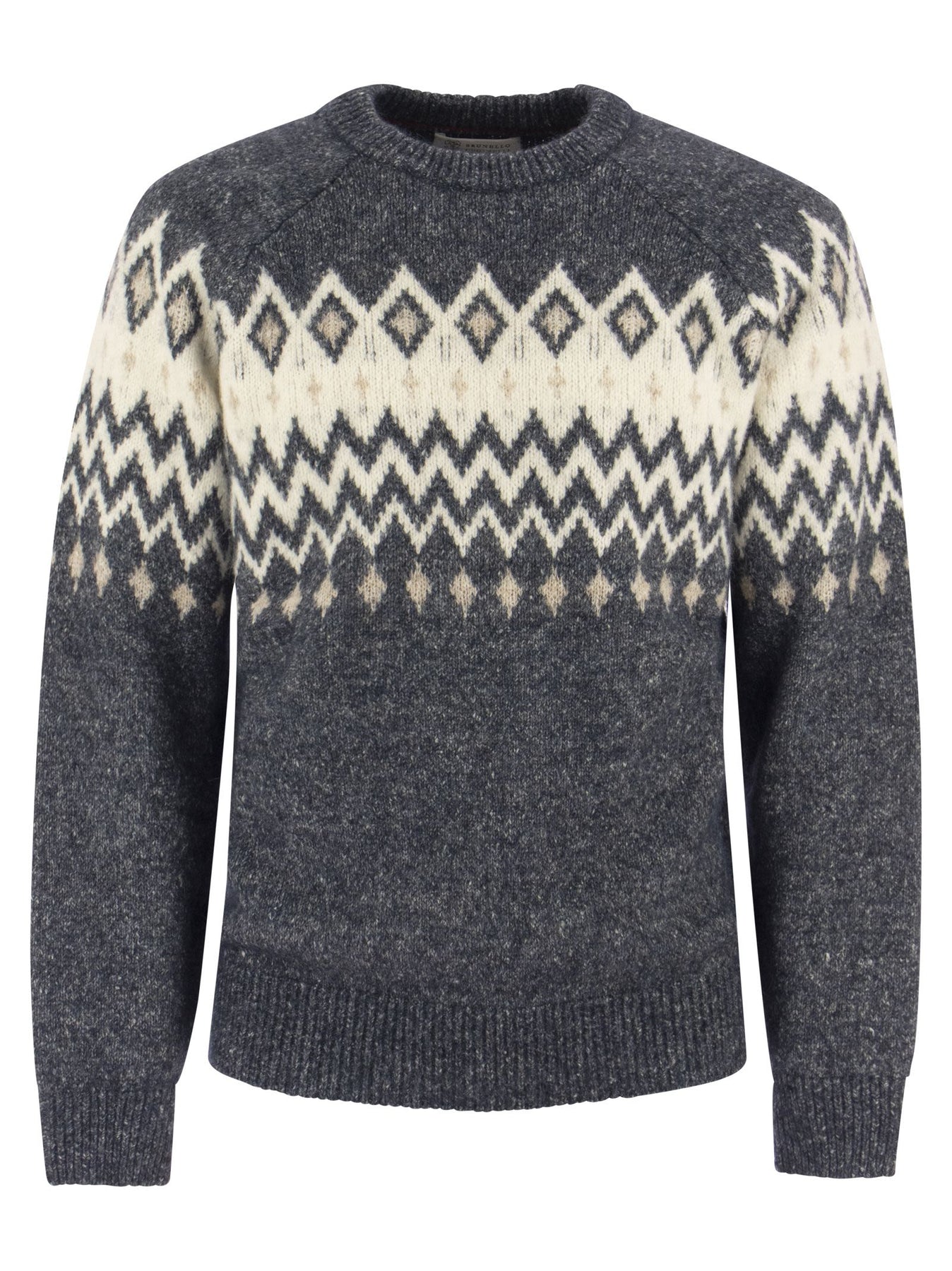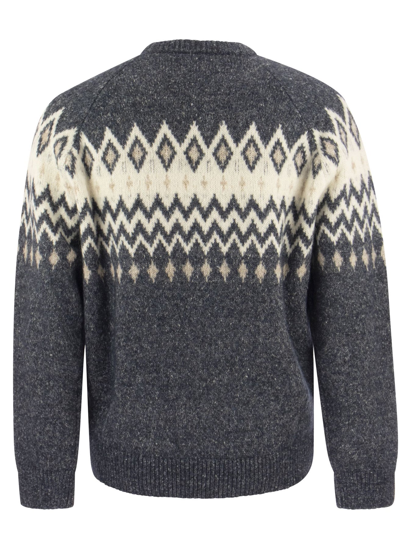 High-quality craftsmanship gives life to the Icelandic Jacquard knit in alpaca, cotton and wool. Thanks to the buttoned structure of the yarn, the special pattern inspired by traditional Nordic designs is enriched by a shaded colour effect that combines with the naturally fluffy texture of the alpaca fibre. Warm and soft, the sweater is ideal for protecting yourself in the coldest moments of the season. - Crew neck - Raglan sleeve - Rib knit cuffs and hem - Jacquard knitting DESIGNER ID: MSO504300 CPL53 37% Alpaca, 30% Cotton, 26% Polyamide, 7% Wool