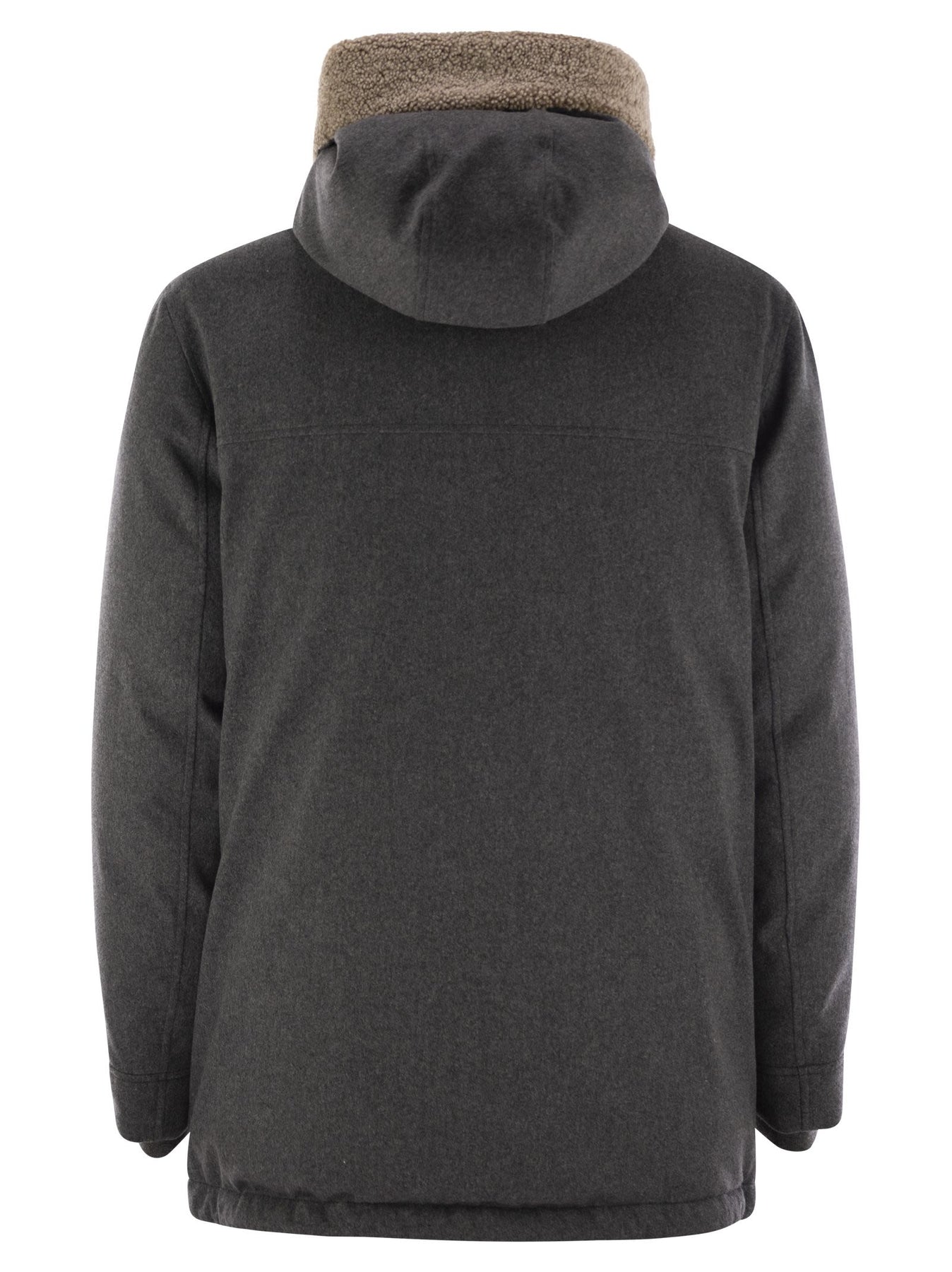 Brunello Cucinelli Men Membranated Wool Flannel Parka Down Jacket With Hood And Shearling Insert