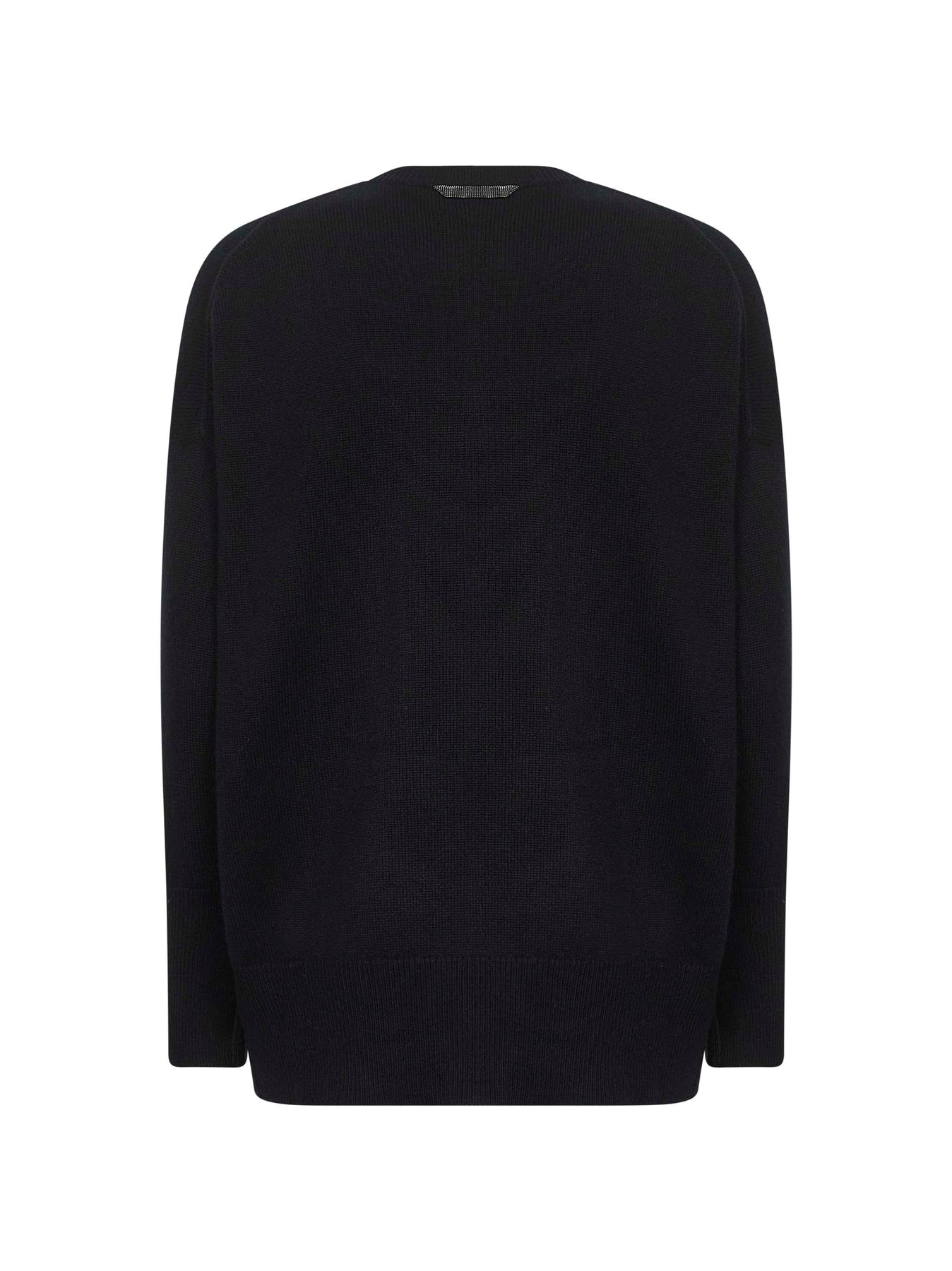 •Ribbed crewneck; nickel-free embroidered monili loop-tab at neck back •Long sleeves, dropped shoulders •Ribbed cuffs and bottom band •Plain stitch knit •Long hips-lenght cut •Relaxed fit •Black color •100% Cashmere •Made in Italy