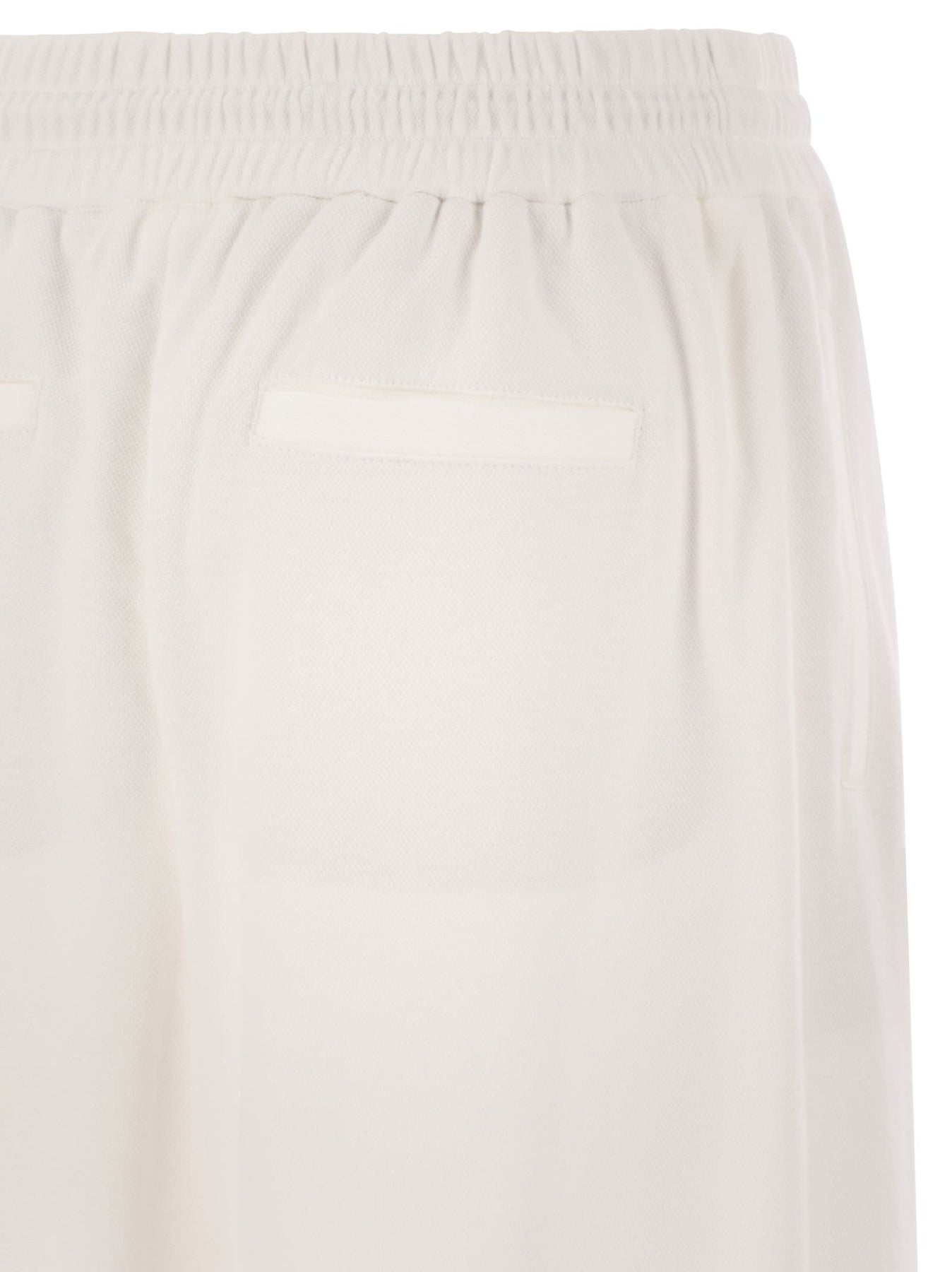 Fine Brunello Cucinelli materials meet the informal style of the Travelwear line, dedicated to moments of relaxation and free time. The new Track trousers in couture interlock combine sporty taste and an informal yet refined texture. The relaxed and comfortable silhouette is enhanced by the drawstring waist detail. The cotton interlock Couture fabric is characterised by a compact, smooth and homogeneous surface, balancing informality and sophistication. The stretch structure favours wearing comfort. - Pull-up trousers - Elasticated waistband with drawstring - Front pockets DESIGNER ID: MG927VD299 C7220 93% Cotton, 7% Polyamide Pocket lining: 74% Acetate, 26% Silk