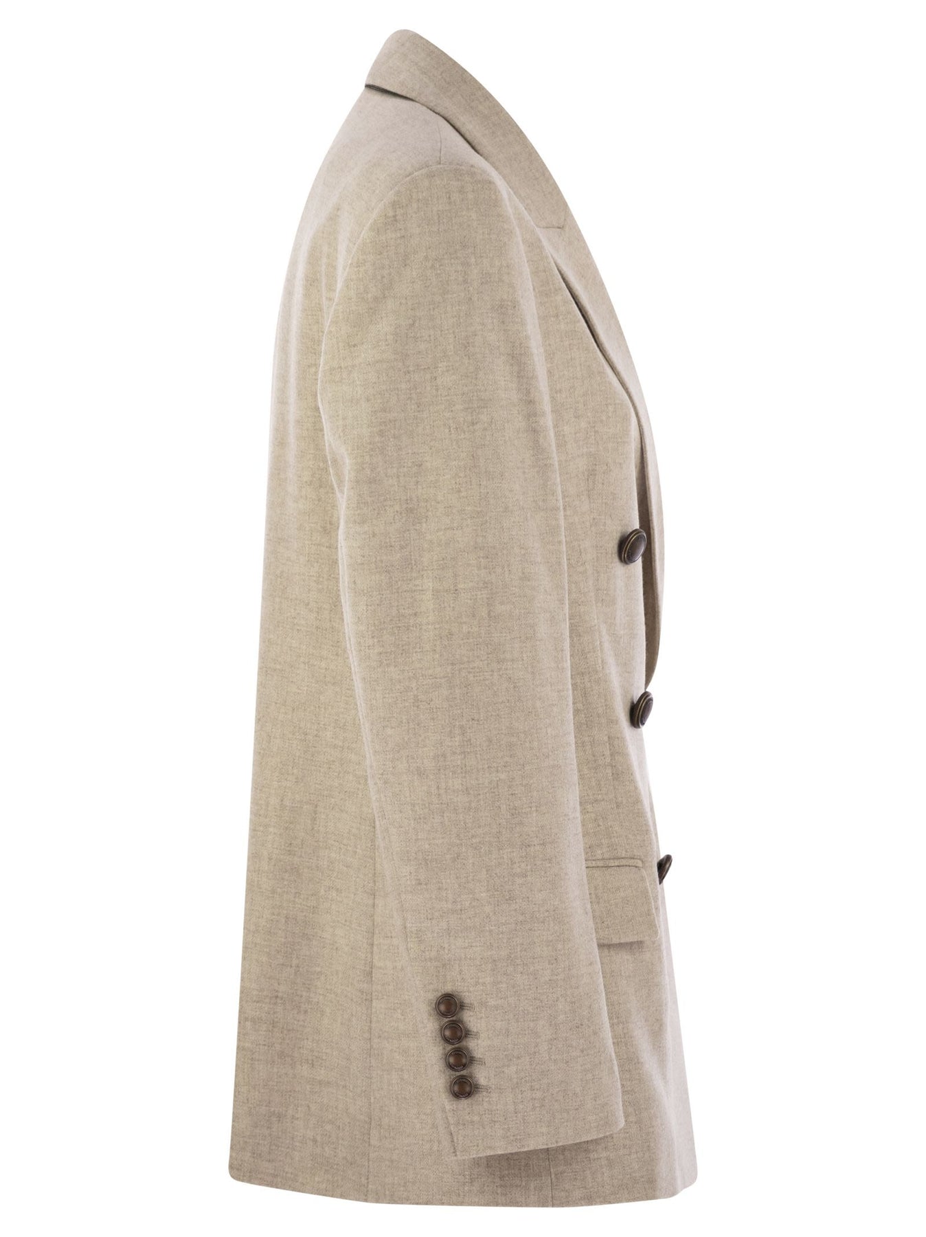 Fine materials and precious details come together in the new virgin wool and cashmere twill flannel jacket. The large peak lapels, double-breasted closure and classic flap pockets emphasize the tailored look of the model, interpreted in a feminine and sophisticated way. The fine fabric, soft and enveloping, gives a pleasant sensation of warmth, while a delicate embroidery in brilliant monili, an iconic decoration of the Brunello Cucinelli collections, completes the jacket with a refined touch of light. The virgin wool and cashmere twill flannel stands out for its unmistakable diagonal weave, which gives structure and resistance to the fabric. The hand is extraordinarily soft and enveloping, giving a sensation of warmth and comfort when worn. - Metal button closure - Silk blend crepe lining - Peak lapel - Chest pocket - ​​Lower flap pockets - Cuffs with four metal buttons - Single vent on the back - Nickel-free monili decoration DESIGNER ID: MB1627054 C012 95% Virgin wool, 5% Cashmere Lining: 74% Acetate, 26% Silk Sleeve lining: 65% Acetate, 35% Polyester Application Eco finish brass