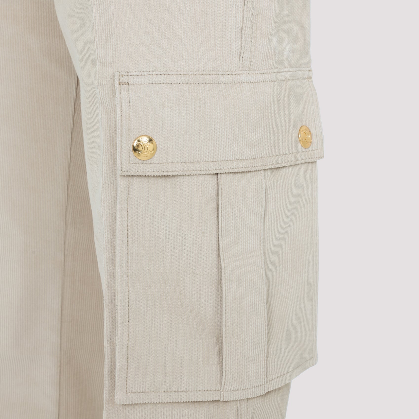 Celine Beige Cotton Cargo Pants. Pure beige cotton pants, front concealing zipped fastening, front buttoned fastening, belt loops, side pockets, back flap buttoned pockets, cargo pockets along the legs, flared leg, straight hem, tonal stitching, gold-tone hardware. Cotton | 100%COTTON