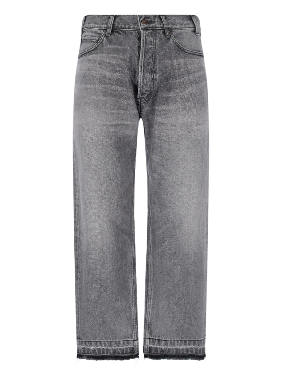 Celine straight 'Wesley' jeans in grey denim with distressed wash, low waist, belt loops, button closure, five pocket design, back logo patch, straight leg.