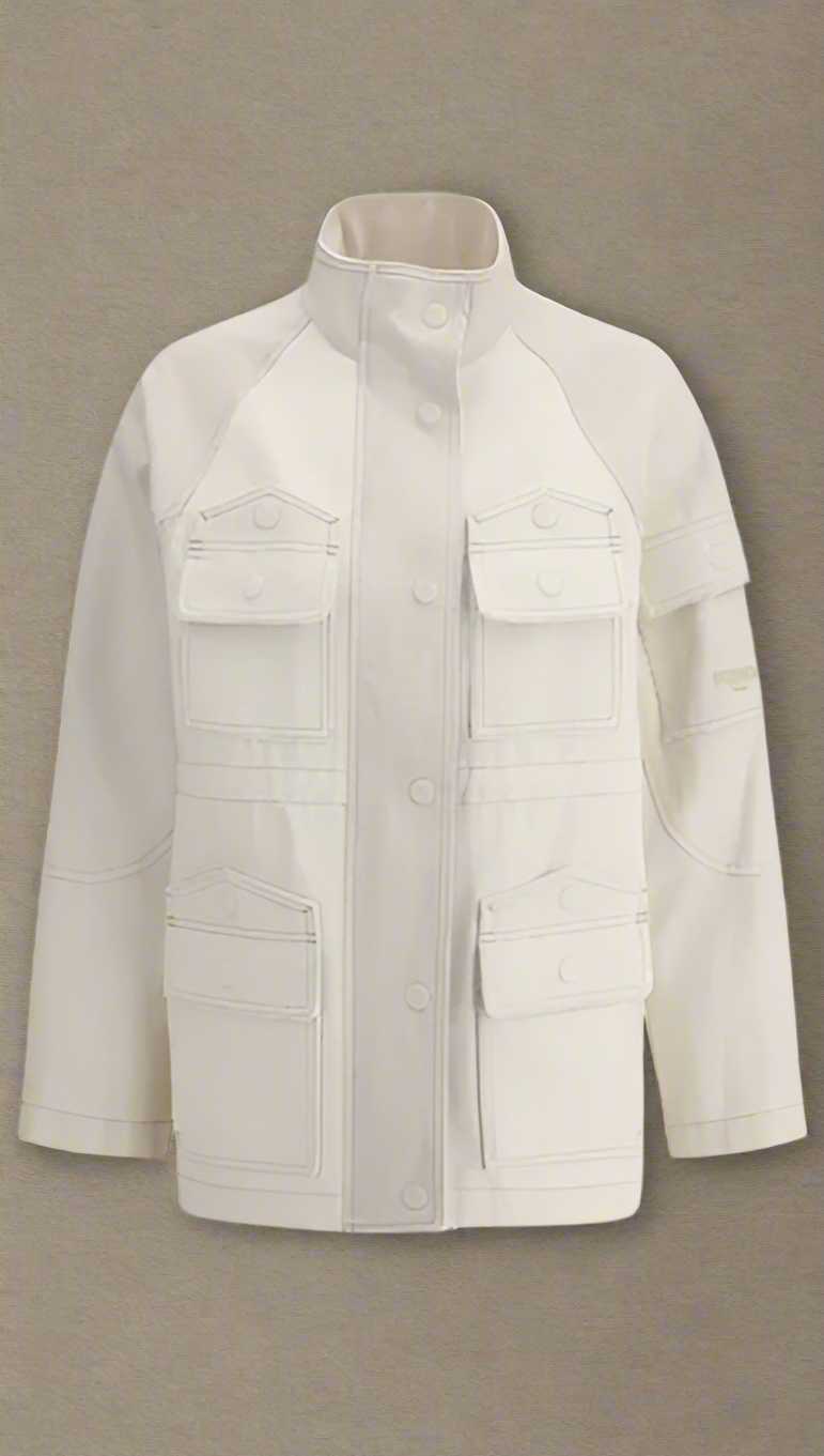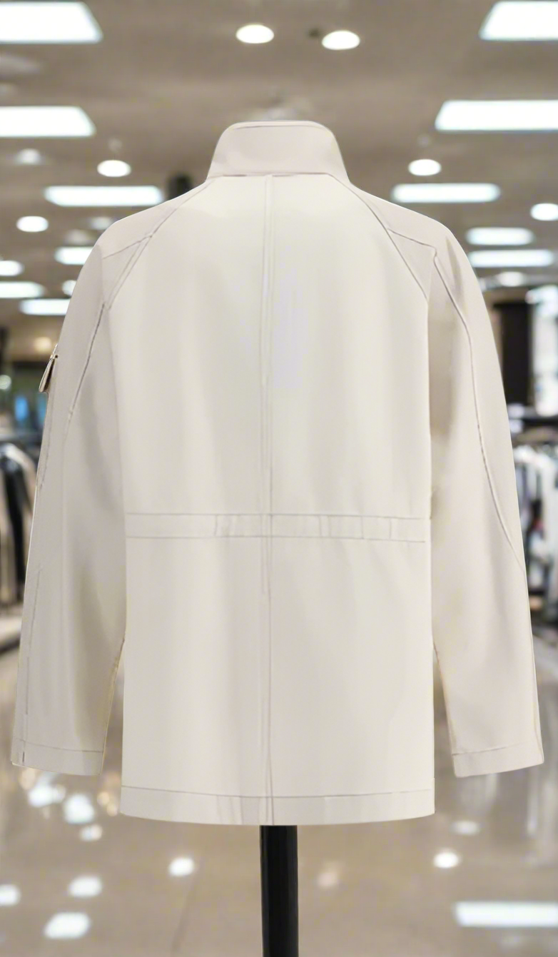 The front snap closure lends practicality and a clean design, while the four front patch pockets with flap and buttons provide ample storage space with a touch of functionality. The patch pocket on the left arm, decorated with the brand’s iconic logo, adds a discreet and modern luxury accent.
