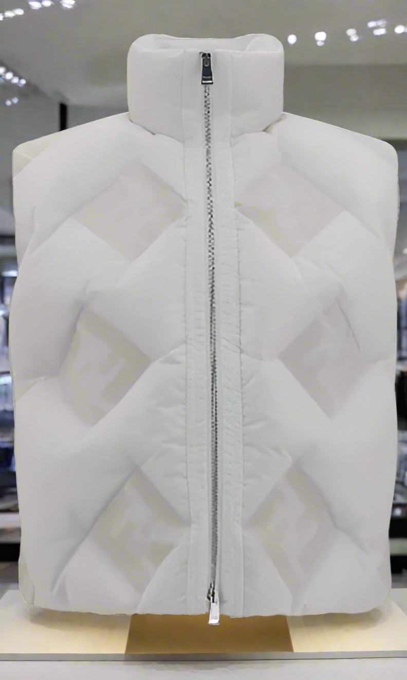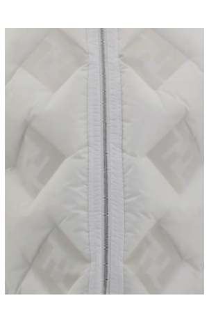 The Fendi Down Vest features a refined and practical design, characterised by a high collar and a double-slider zip front closure. The geometric padding adds a distinctive touch, while the brand’s iconic logo, repeated across the entire surface, adds an element of recognisability and prestige. A garment that combines elegance and functionality, perfect for a sophisticated look in the colder seasons.