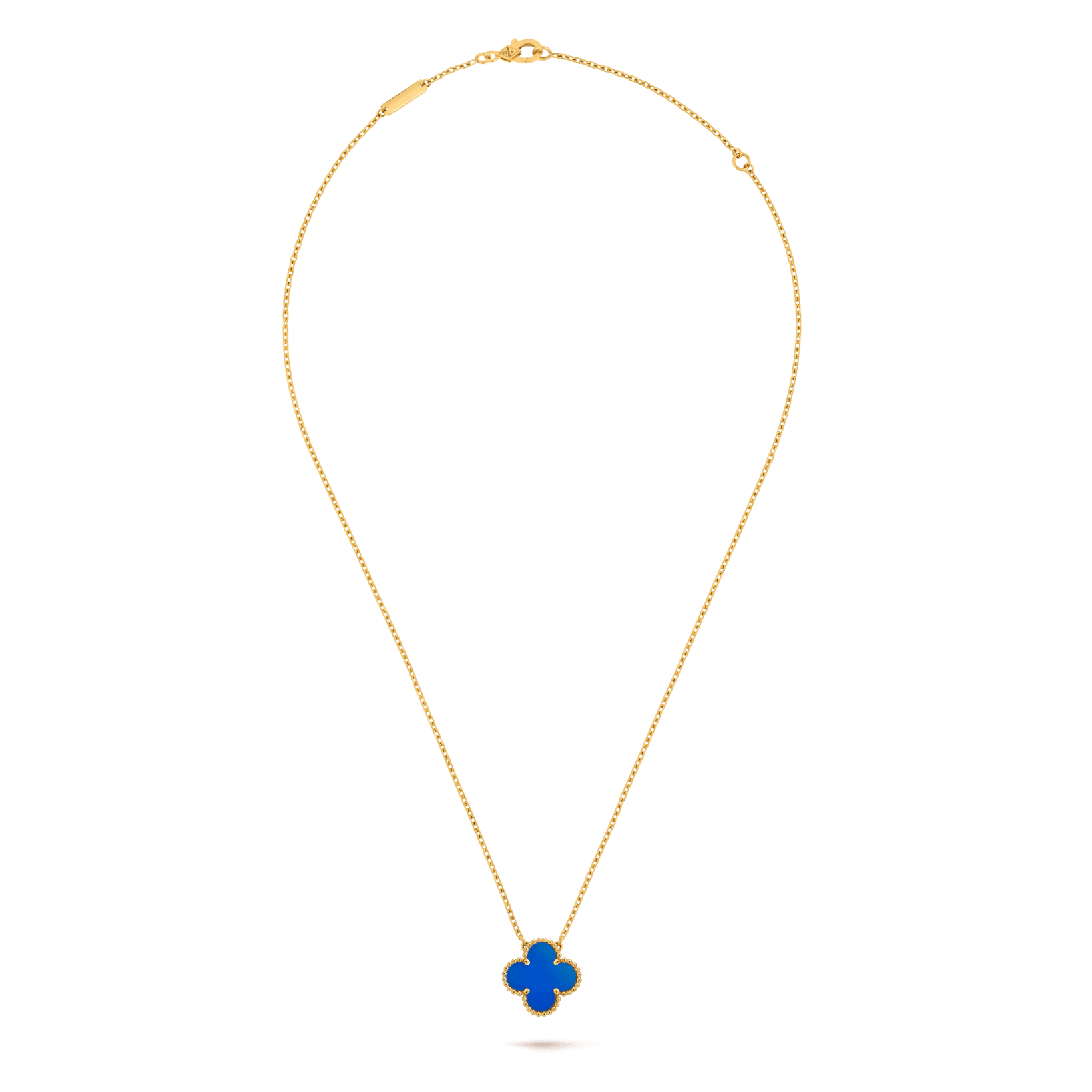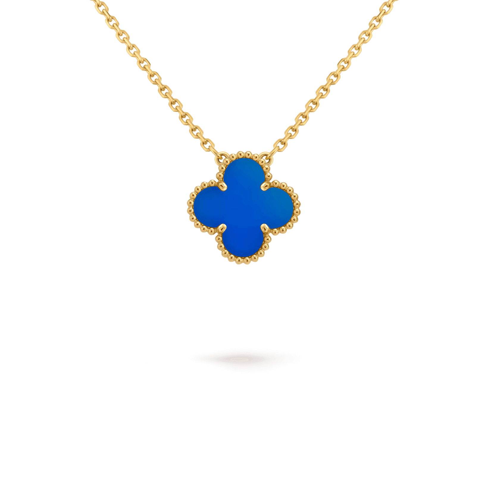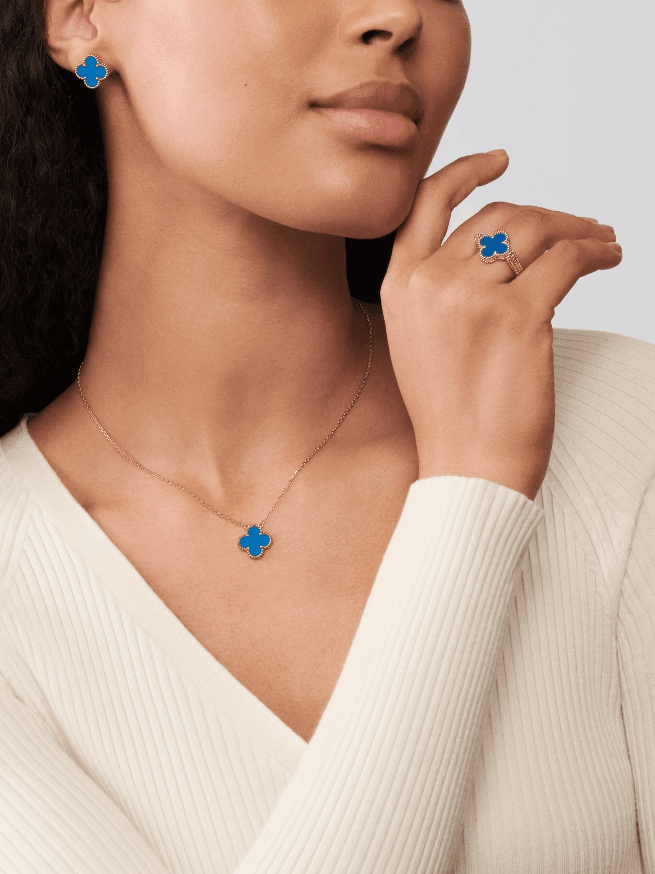 Model showcasing Van Cleef & Arpels Vintage Alhambra pendant 18K yellow gold, Agate jewelry, featuring blue accents. >
