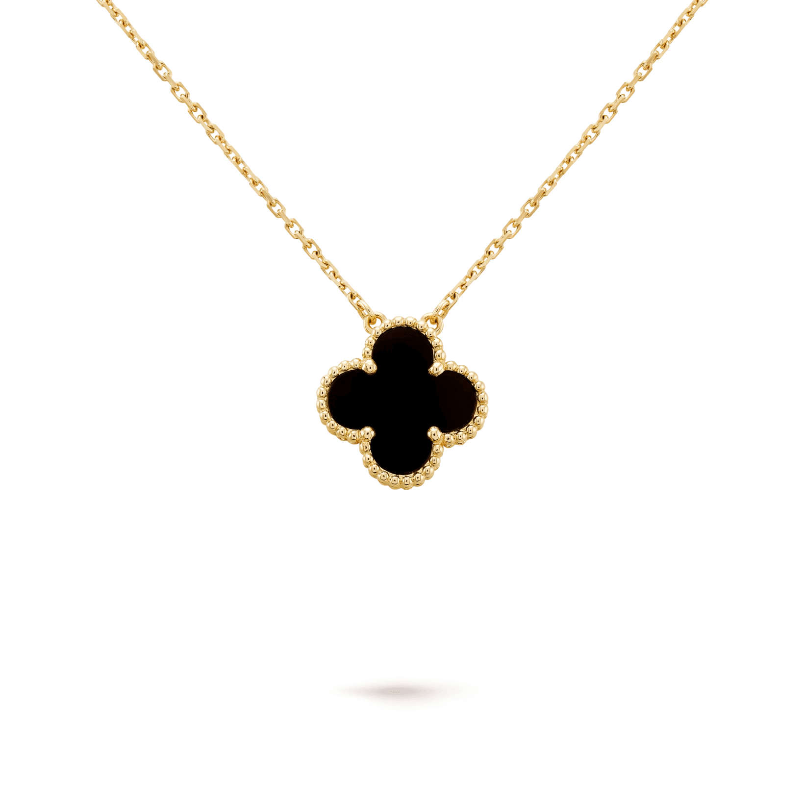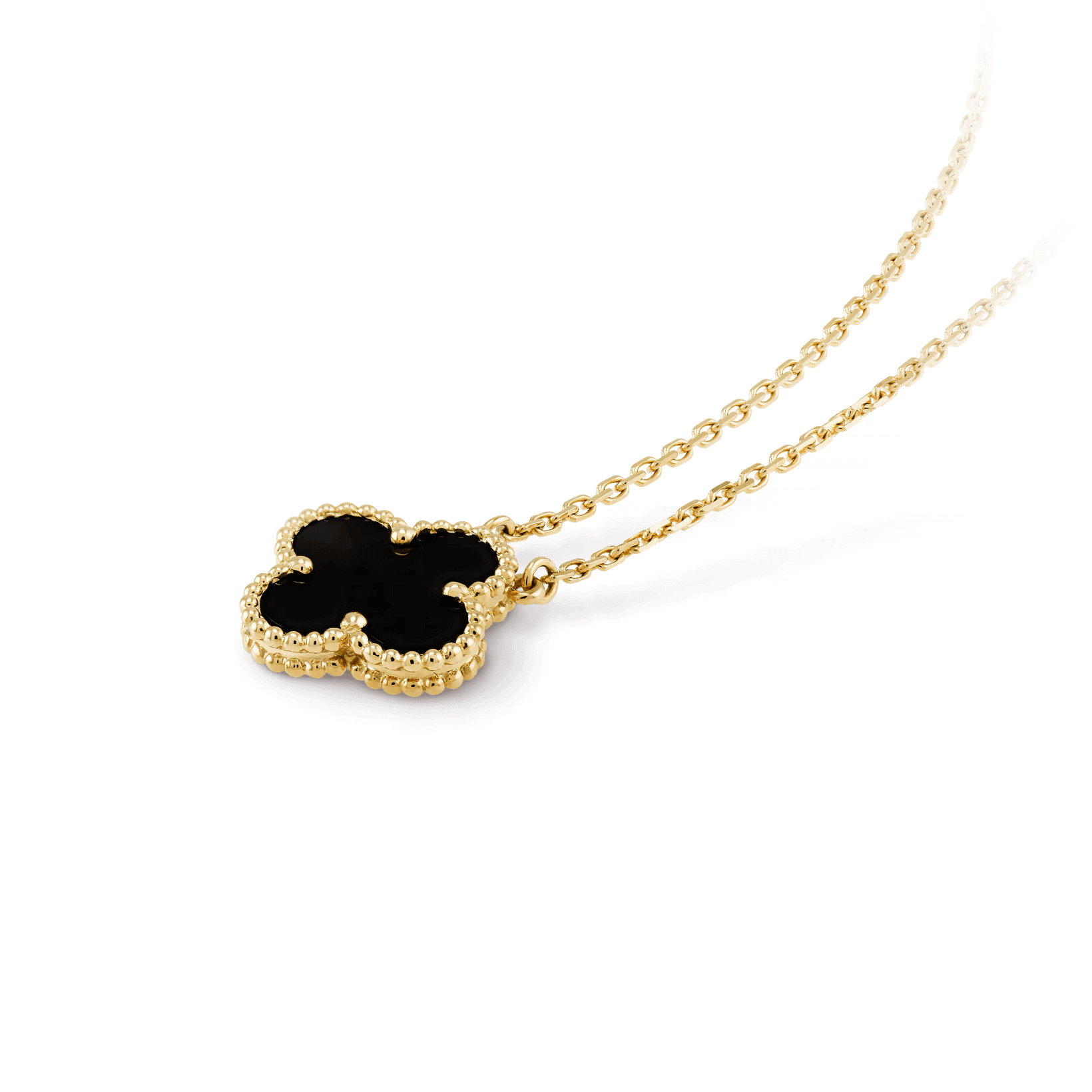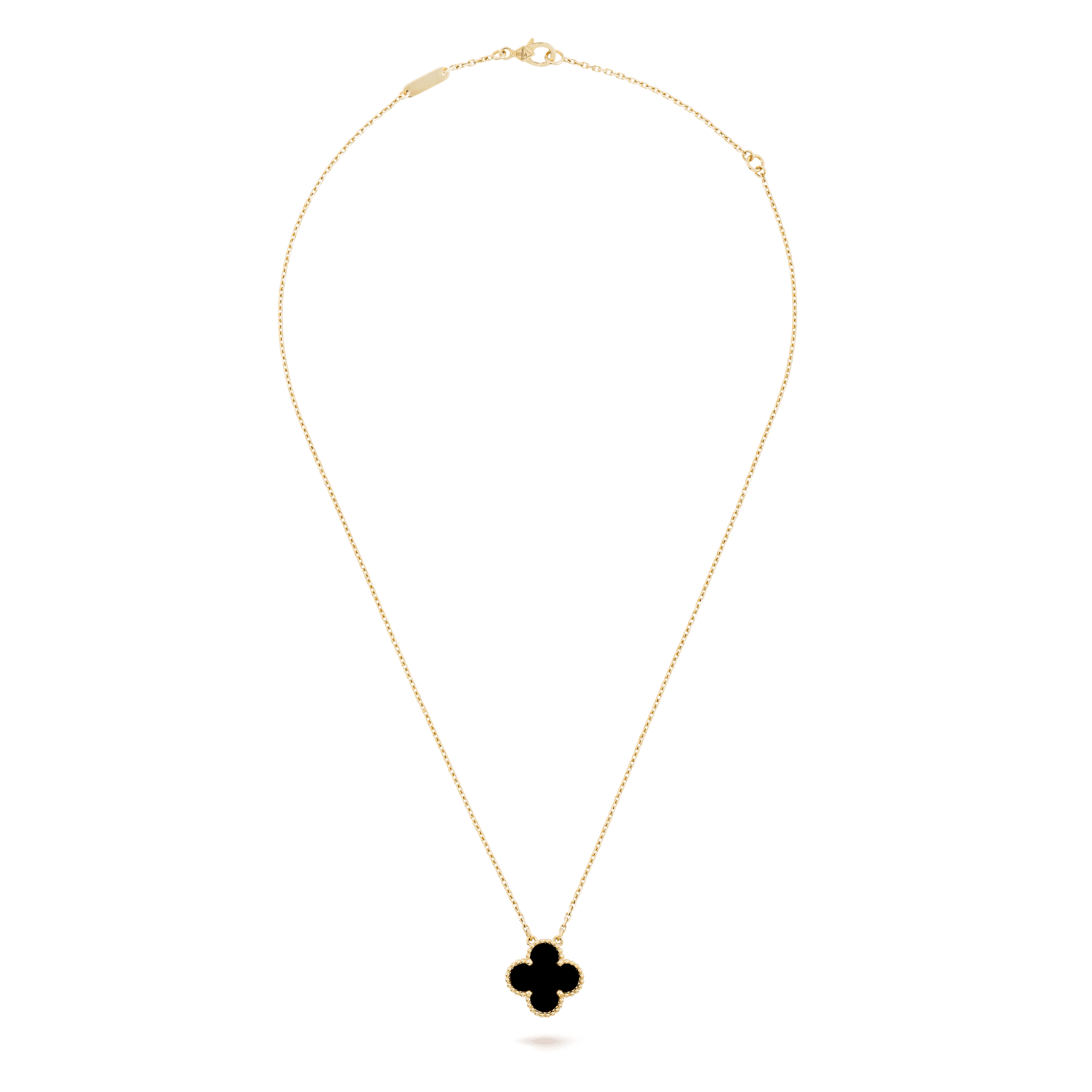 Van Cleef & Arpels Vintage Alhambra pendant 18K yellow gold, Onyx on a delicate chain, fine jewelry piece. >