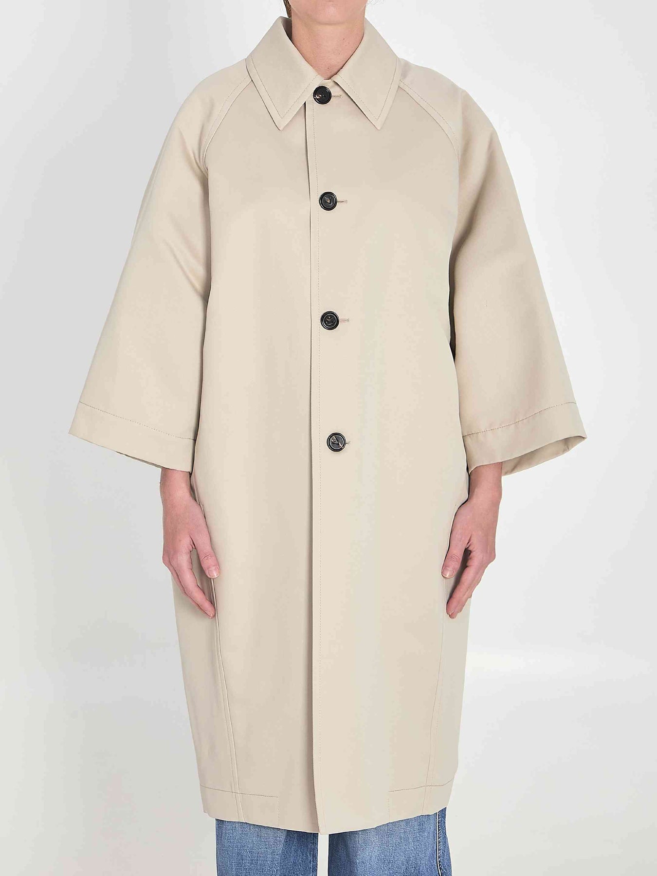 Three-quarter sleeve coccoon-shaped coat in grey silk and cotton twill. It features a pointed collar, front button closure, two hidden side pockets, and an interior with a checked insert.