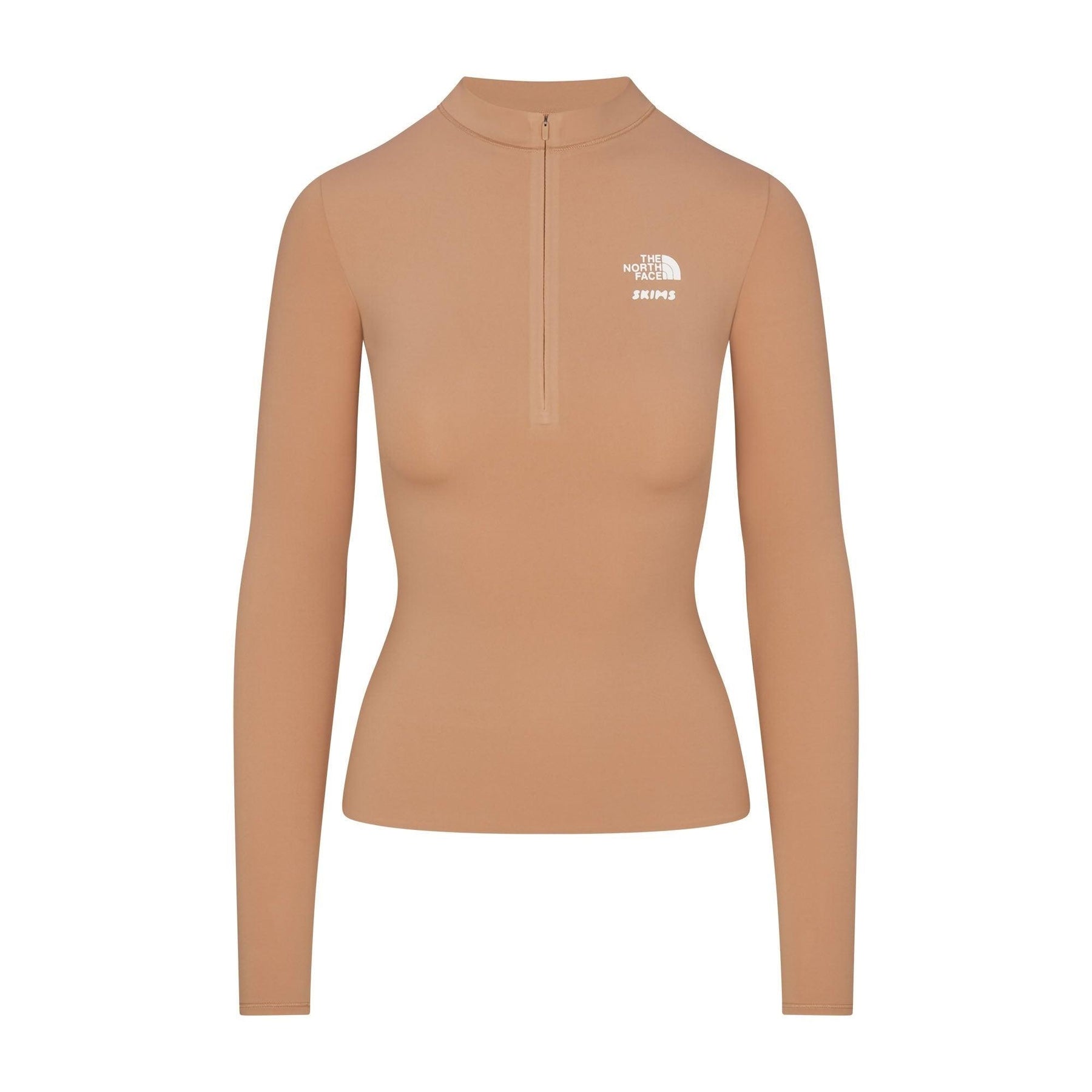 Your ski pass to the perfect base layer. SKIMS signature second-skin comfort and curve definition take shape in this quarter-zip that features body-contouring stitch lines and a concealed front zipper closure. The North Face’s FLASHDRY™ technology keeps you dry and comfortable as you move or lounge. Part of the limited edition The North Face x SKIMS Collection.