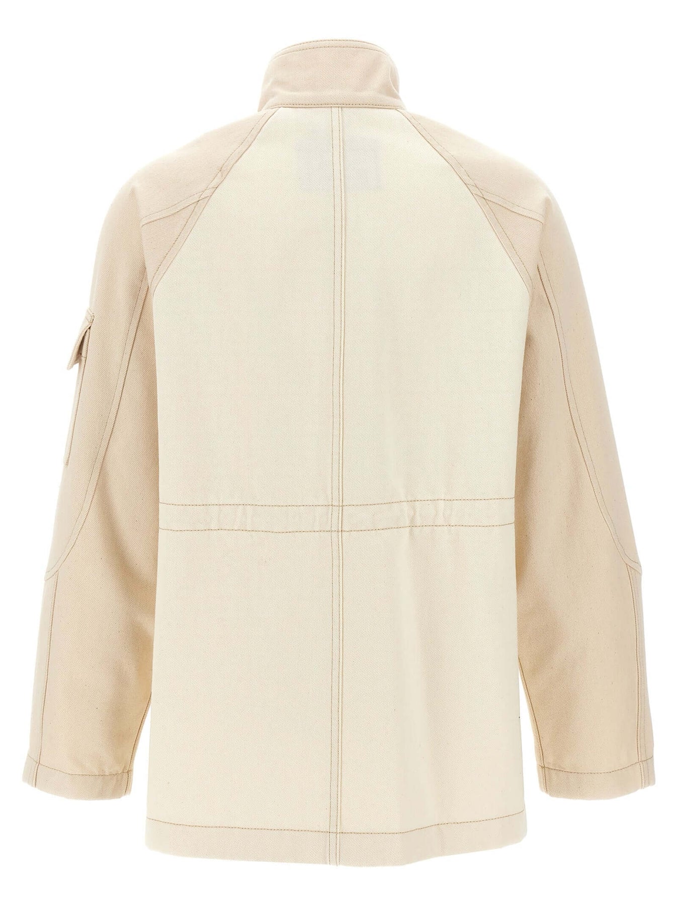 Two-tone cotton denim parka with contrast stitching, high neck, adjustable drawstring at the waist, zip and snap button closure, pockets, long sleeves.