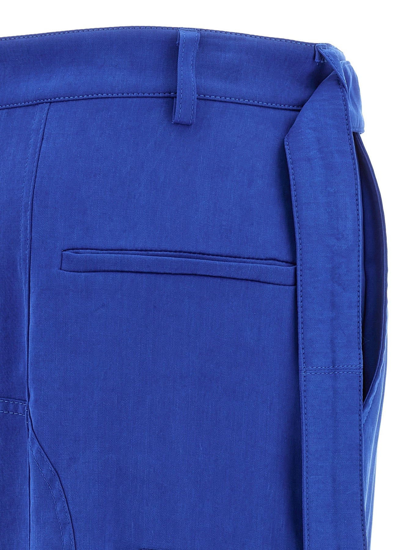 Lyocell trousers, cargo style with pockets, zip and front button closure, cuts and shapes on the leg, pockets, removable sash.