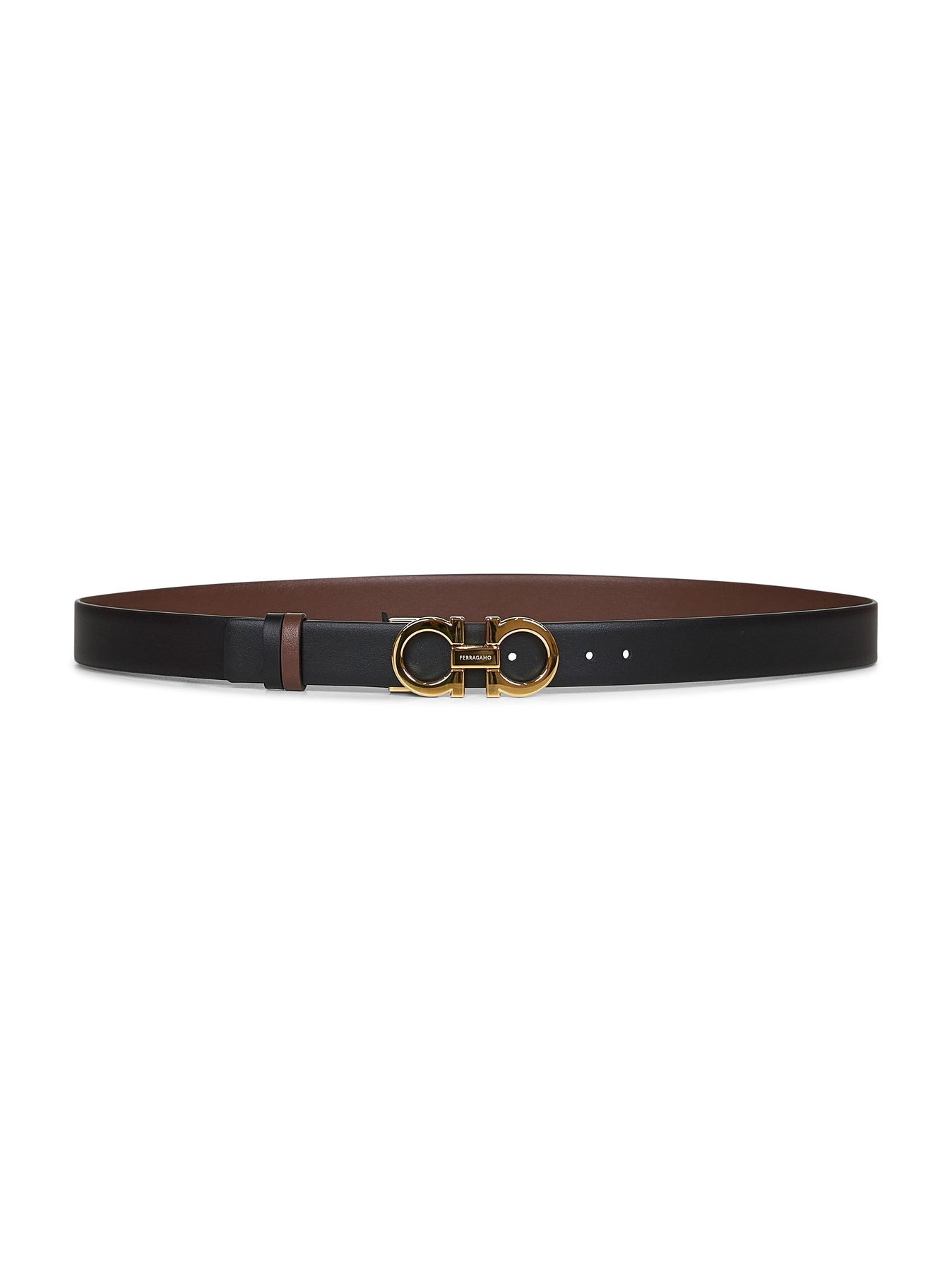 •Adjustable gold-toned metal double Gancini buckle fastening; detachable buckle •Two-tone leather loops •Reversible hammered calfskin leather design •Height: 2.5 cm •Color: cocoa brown/black •100% Calf Leather •Made in Italy