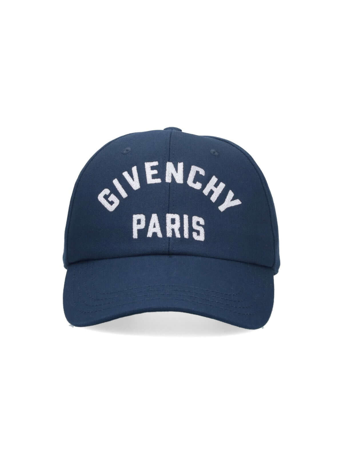 Givenchy logo baseball cap in navy blue cotton with curved visor, white logo embroidery on the front, adjustable strap at the back, and logo detail engraved on the buckle.