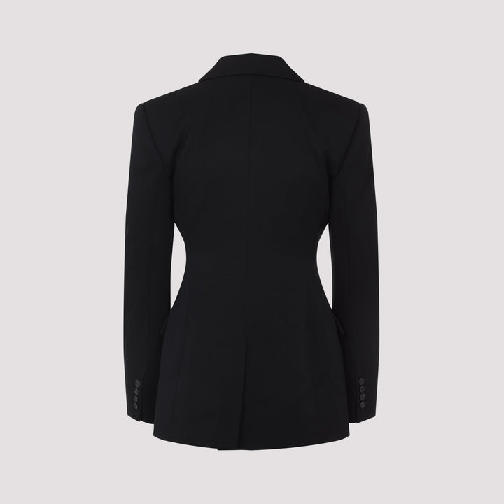 Givenchy Black Wool Jacket. Crafted from black wool, tonal satin peak lapels, double-breasted, welt pocket on the chest, two flap pockets, reinforced shoulders, long sleeves, buttons at the cuffs, back central slit, hourglass silhouette, lined. Wool | 100%WOOL