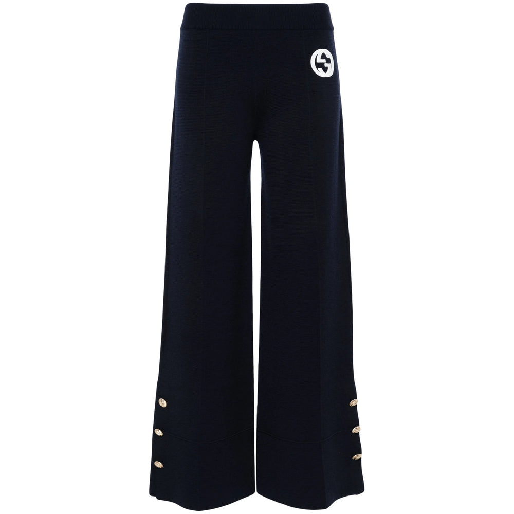 navy blue wool blend waffle knit signature Interlocking G logo patch to the front pressed crease side slits with decorative button detailing embossed gold-tone buttons wide leg elasticated waistband