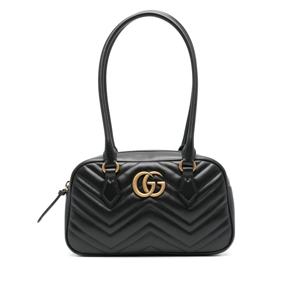 black sheepskin signature Marmont quilting signature Interlocking G logo two rolled top handles main compartment internal patch pocket suede lining gold-tone hardware top zip fastening