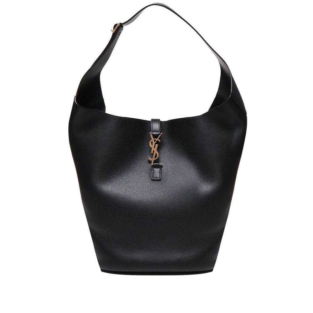 black leather suede lining signature YSL logo plaque hook fastening single top handle main compartment