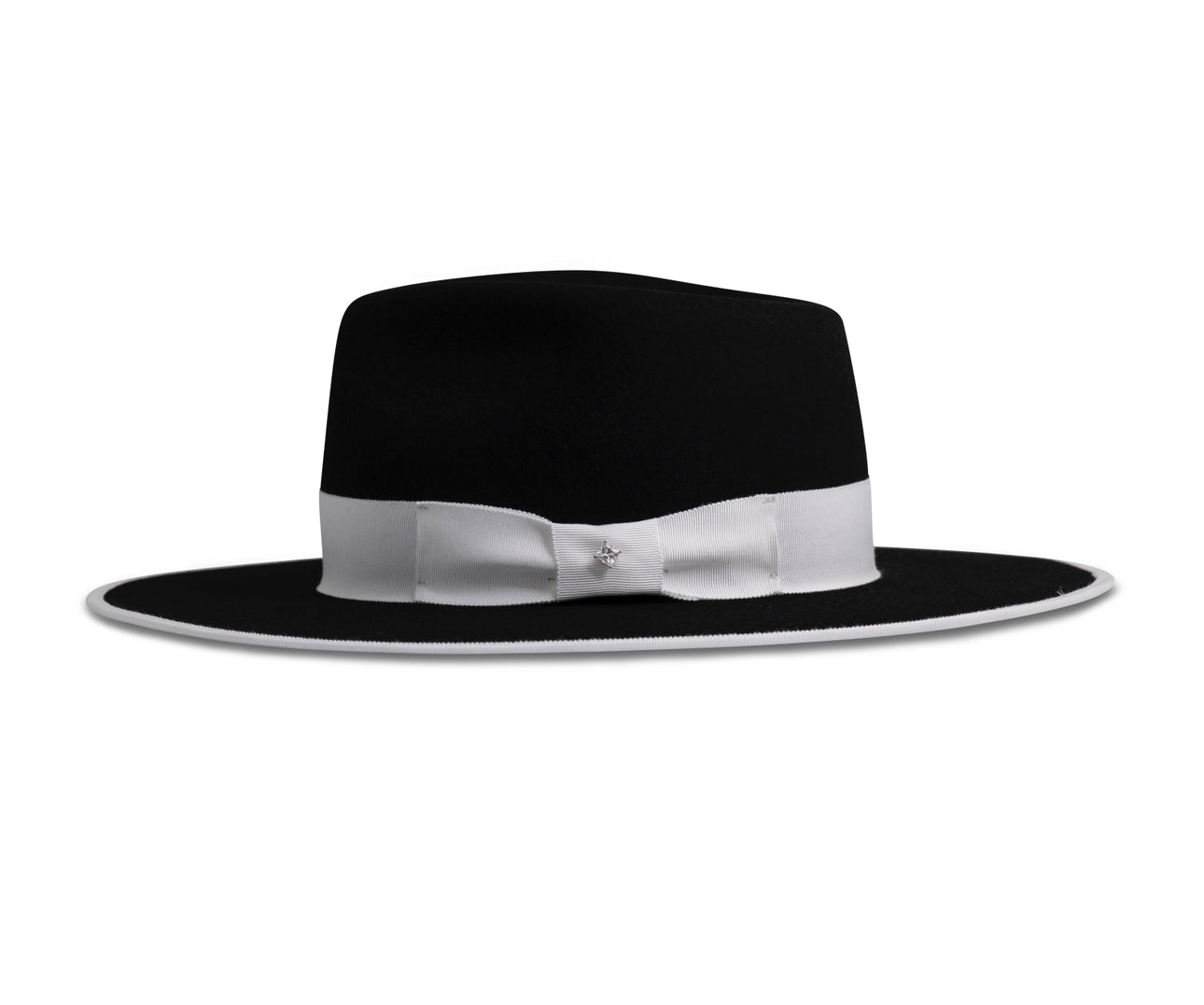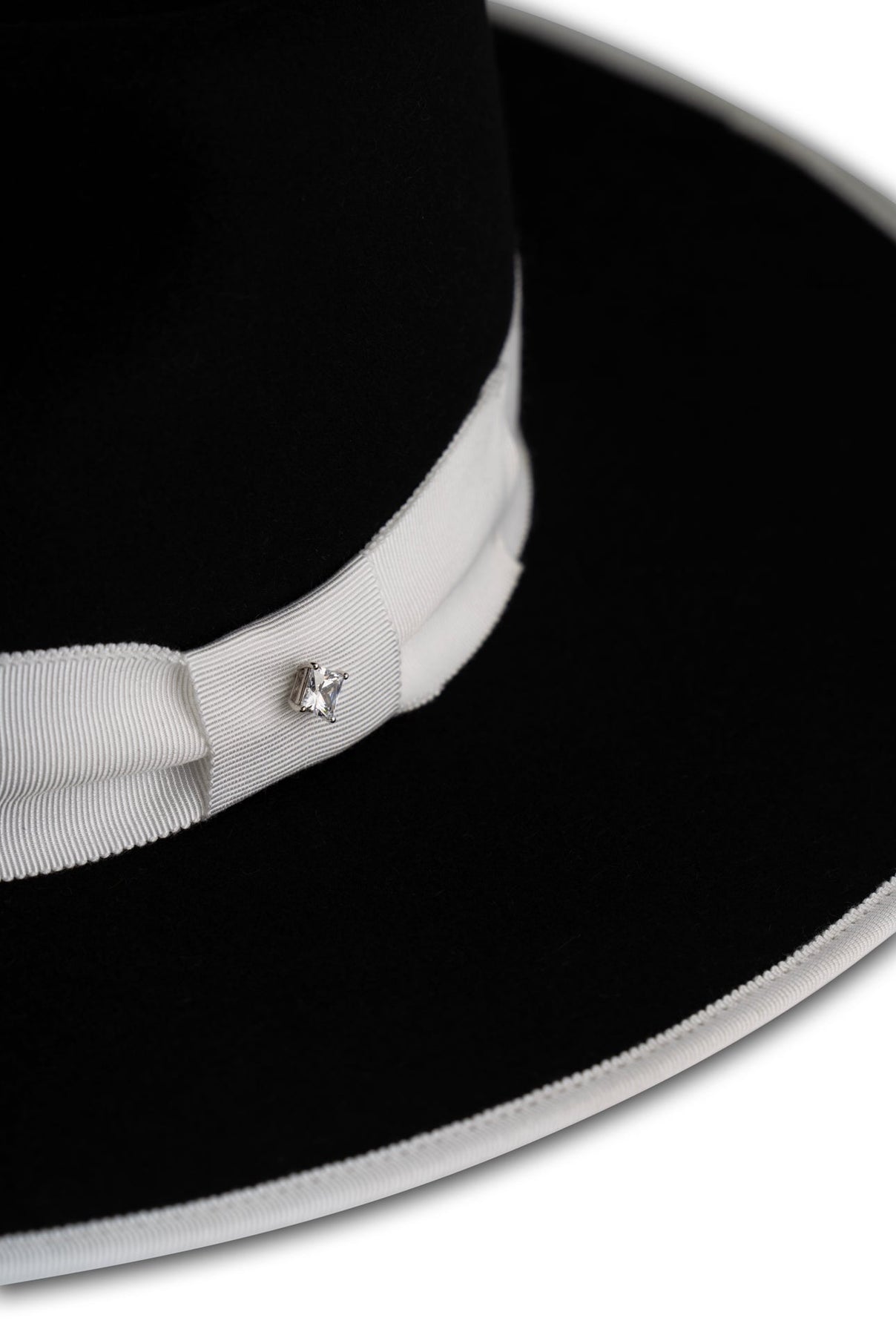 The Black Stud is made with 100% American rabbit felt, giving a soft texture and gorgeous sheen. The distinctive style is accented by a large, 4 3/4" teardrop crown and 3 1/2" flat brim. Regardless of the color options you choose, the Black Stud can be identified by the signature sparkling stud featured in the middle of the ribbon.