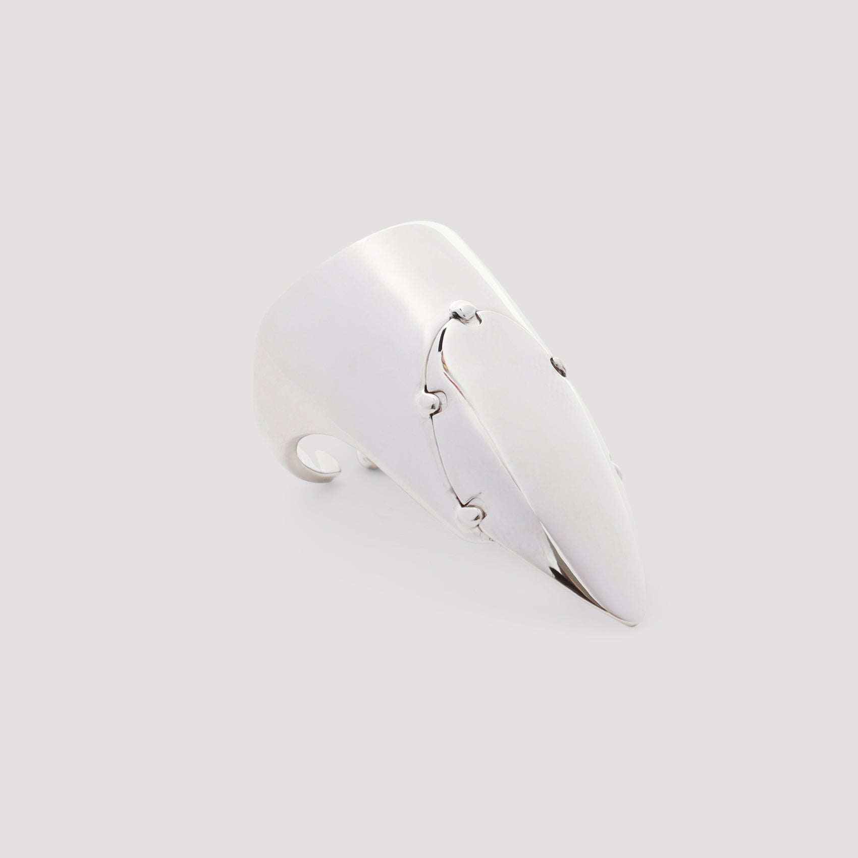 The Jean Paul Gaultier Nail Ring for Women features a sleek, adjustable silver-tone brass design with an engraved logo, combining style and authenticity.