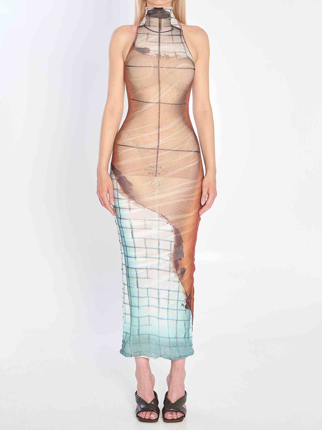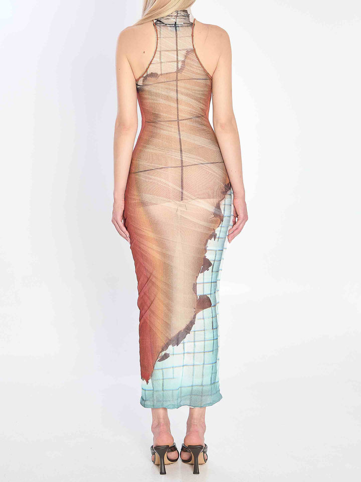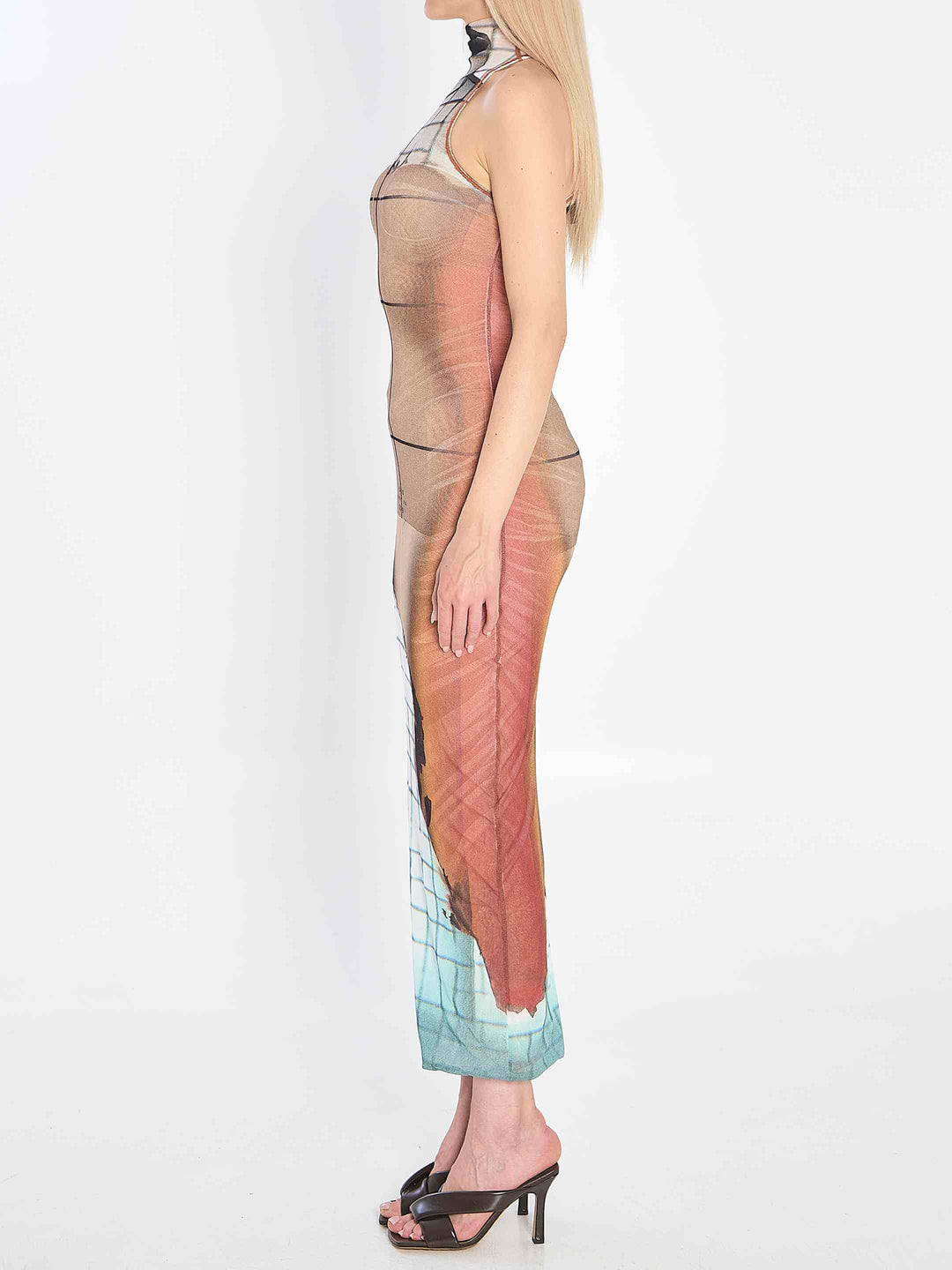 This slim-fit long dress features a striking Fire print with a soft high neck and mohair accents. Made from stretchy polyamide fabric with a tulle lining, it offers both comfort and style. Sleeveless and elegantly designed, it’s perfect for making a bold statement.