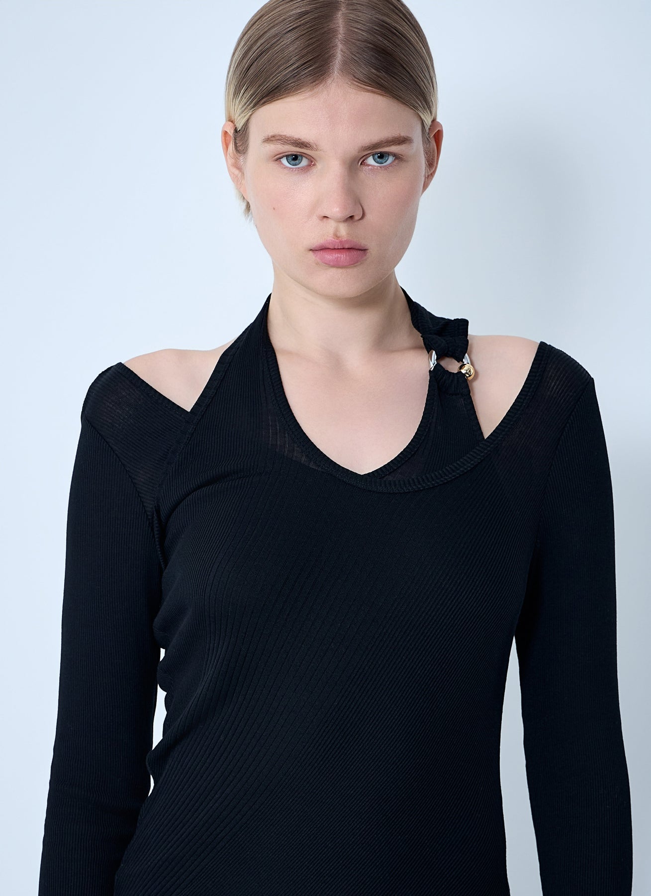 Person wearing a black long-sleeve top with cut-out design on a white background >