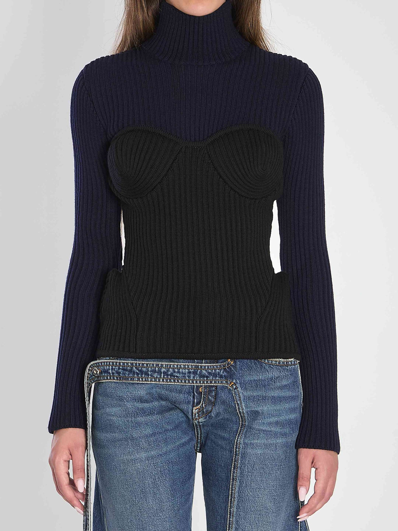 Ribbed knit pullover in black/navy wool blend. Features a high neck, long sleeves, hip-length cut, and stretch fabric. Inspired by corset layerin Form-fitting silhouette.