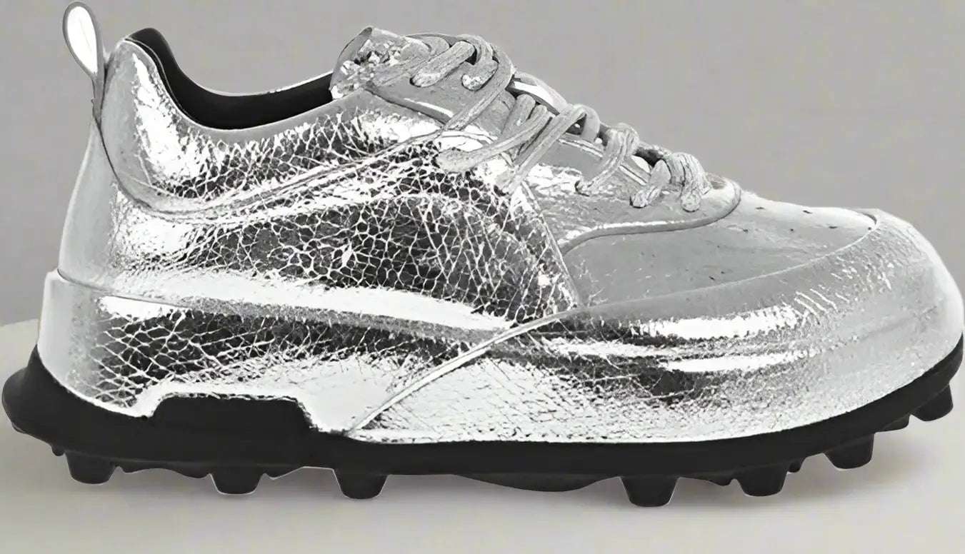 Jil Sander presents these meticulously crafted Textured Lamè Leather Lace-up Sneakers from the WOMEN'S DAY Spring-Summer collection. Manufactured in Italy to exacting standards, these silver footwear pieces feature a technical round toeline design complemented by a performance-oriented rubber sole. The distinctive textured leather construction ensures both durability and sophisticated aesthetics. Reference P622696 denotes authenticity and premium craftsmanship in this specialized footwear offering.