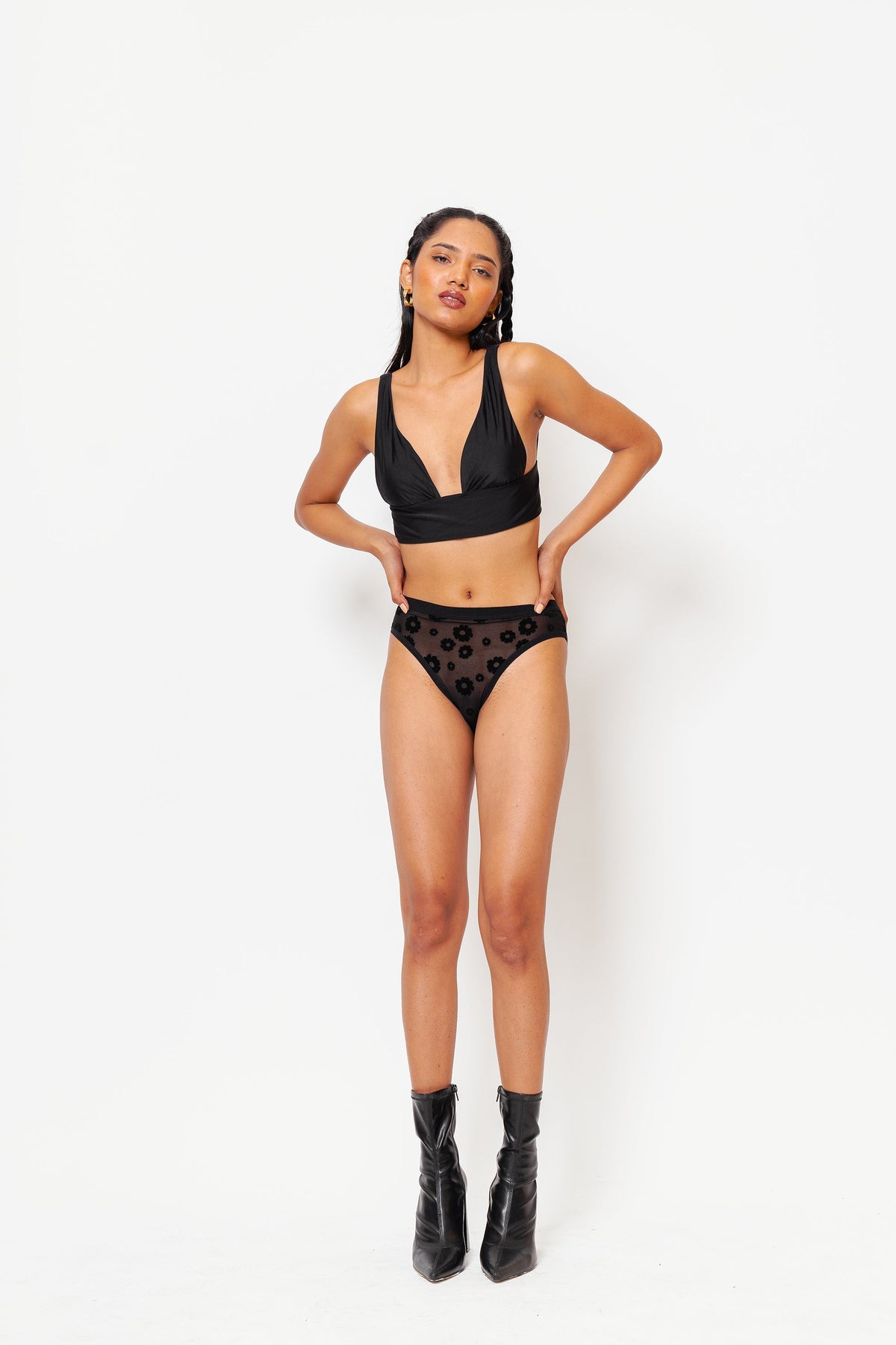 This high-waisted bikini features a daisy flocked mesh design, adding a touch of elegance and playfulness. The keyhole opening at the back waist provides a modern twist on a classic style. Made from 90% Nylon and 10% Spandex, it offers a comfortable and flattering fit. Available in sizes XS–2X.