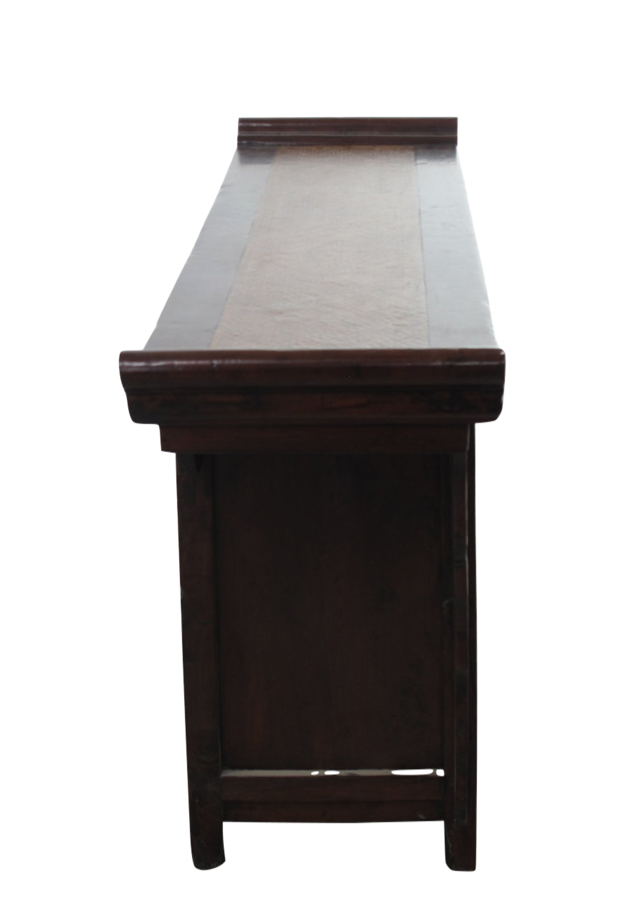 This altar cabinet was used as an altar table to place offering to the ancestors in its old days.   With everted ends and handsome traditional Chinese brass drawer pull and full moon door lock, this later 19th century antique Chinese buffet sideboard altar table adds Asian sophistication and calm to any space.
