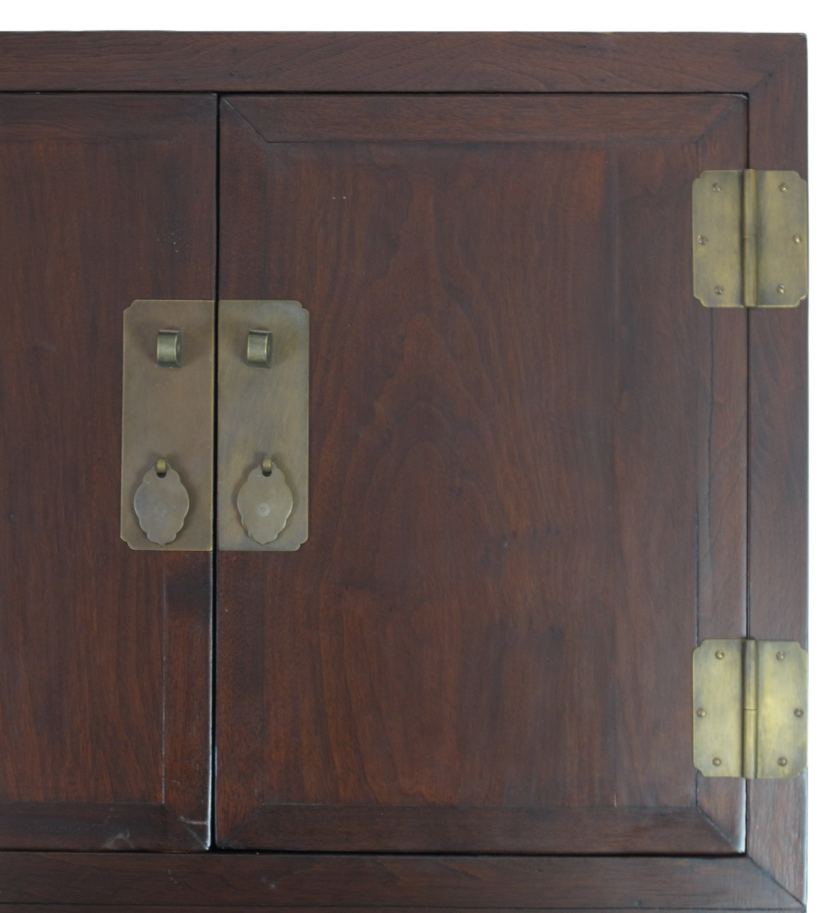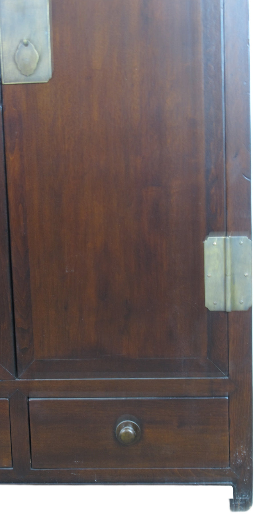Traditionally this classic Chinese storage cabinet was always used as a pair and placed symmetrically in a living room to keep balance. One smaller cabinet on top. The larger cabinet has 2 shelves with one removable and adjustable shelf. The structure and surface restoration was very minimal. This beautiful antique Chinese cabinet will be excellent showpieces in living rooms, great rooms or family rooms.  A pair is available.
