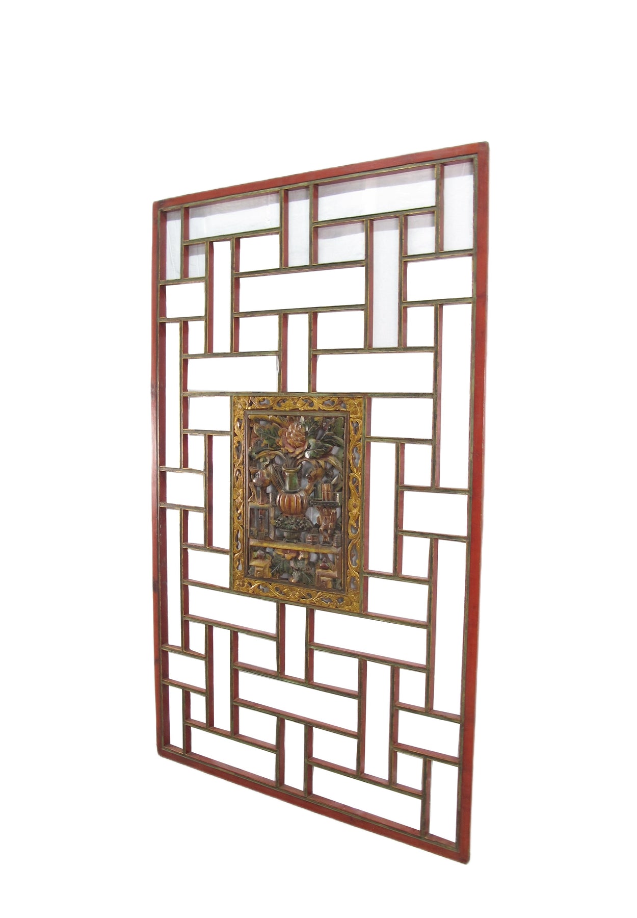 This antique wood panel was used as a wedding ceiling panel in the old China. A beautifully hand carved and painted square plate of the auspicious objects is mounted in the center of the panel. This panels balance out lines and ornament. It will be an one of kind hanging wall art or decorative headboard or ceiling or window.