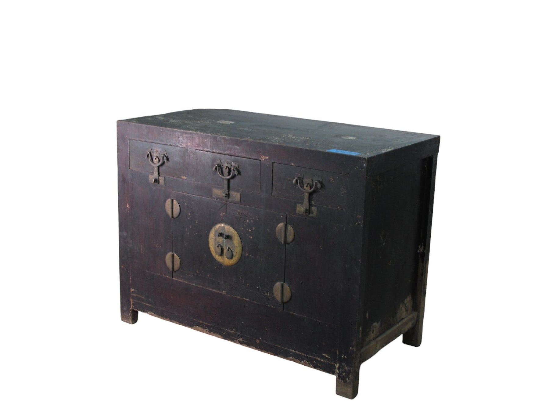 Preserving the authenticity of its origin, the restoration of this antique sideboard from the countryside of Shanxi Province has been intentionally kept to a minimum. The result is a genuine and untouched antique black buffet sideboard that embodies the craftsmanship and character of its historical roots.