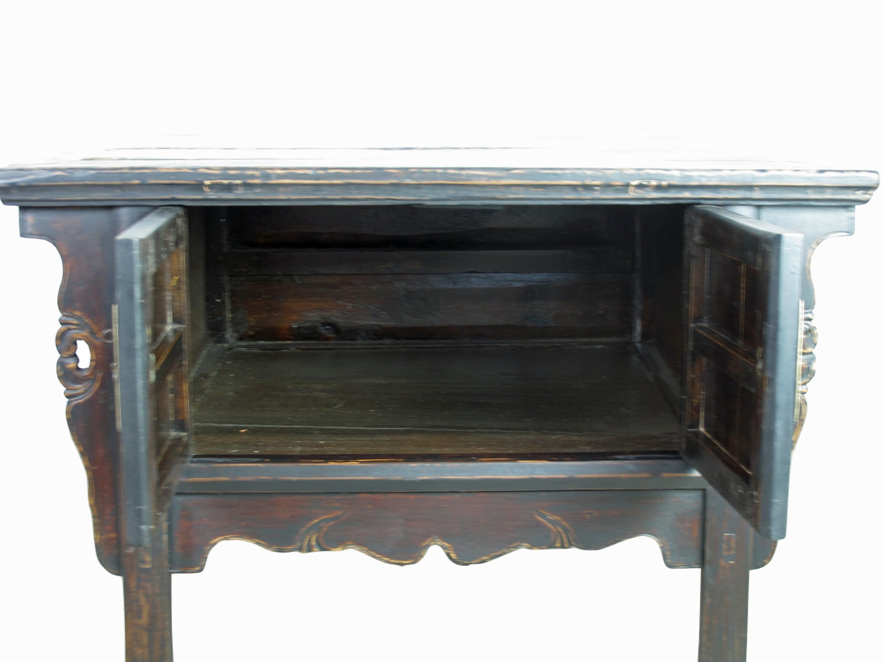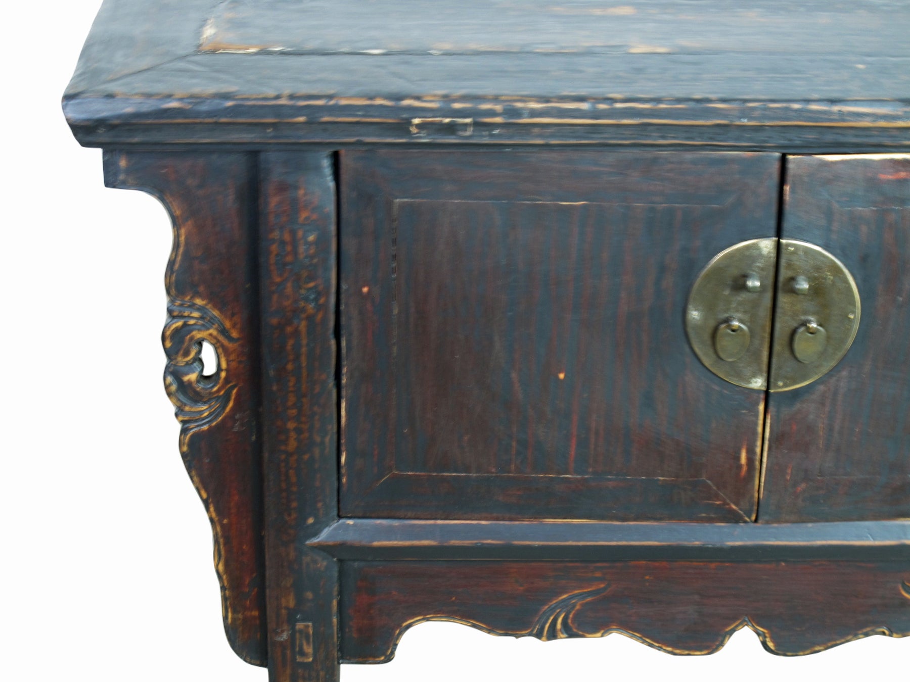 This late 19 century antique Chinese table with one spacious cabinet can be used as a low console table or TV cabinet, or sofa back cabinet table. Decorated by a simple carved front apron and 2 sides, and unique round brassware, this black brown antique side table cabinet adds a calm Asia flair to any room.