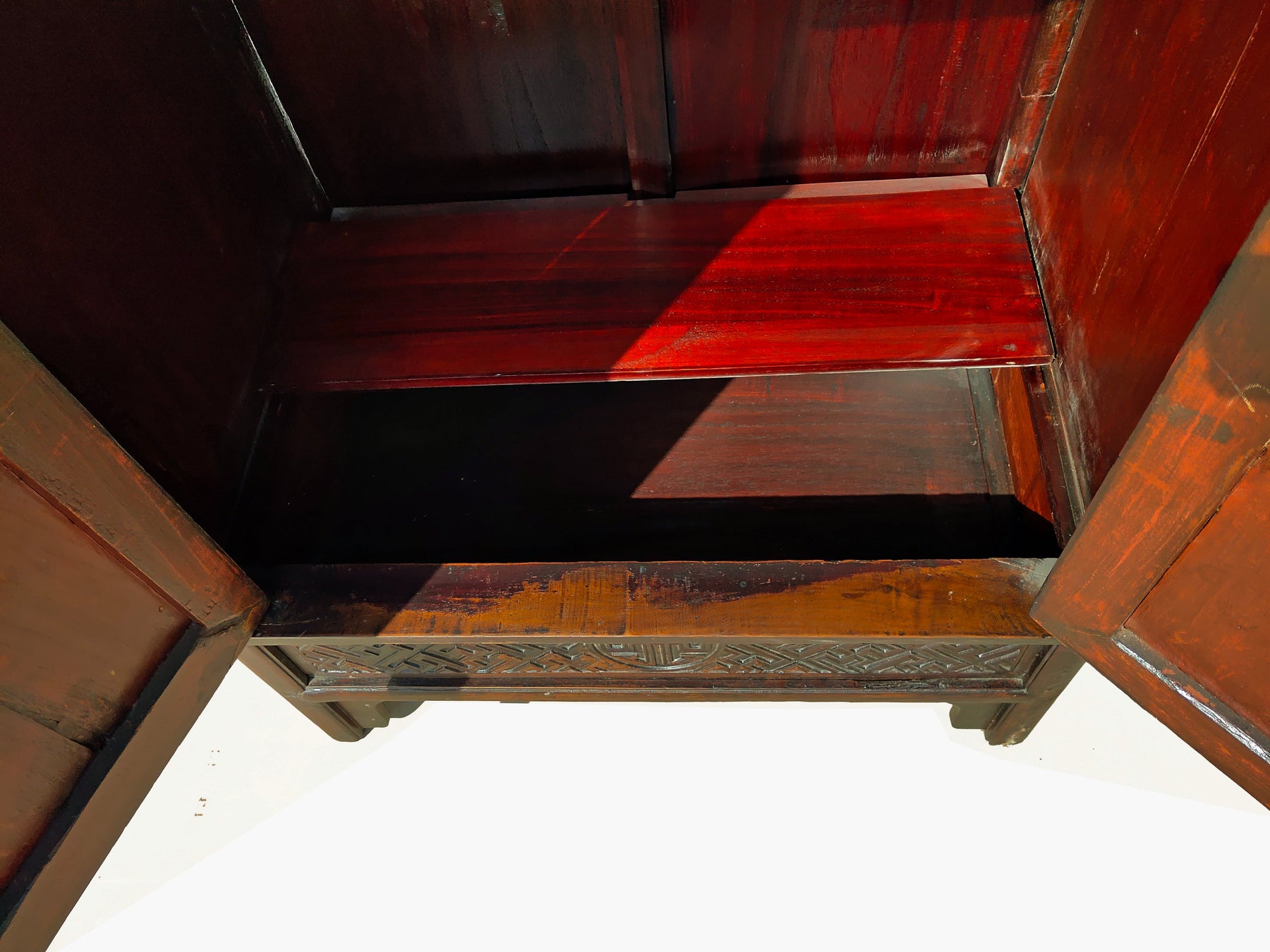This type of armoire cabinet was also called “noodle cabinet” because the round moldings surrounding the cabinet resemble round shaped noodles. This armoire is built of elm using traditional Chinese joinery of tenon and mortise. Smooth, elegant, and classy.  Great to use as an entertainment center or media cabinet. This armoire has 2 shelves and one secret compartment at the bottom.