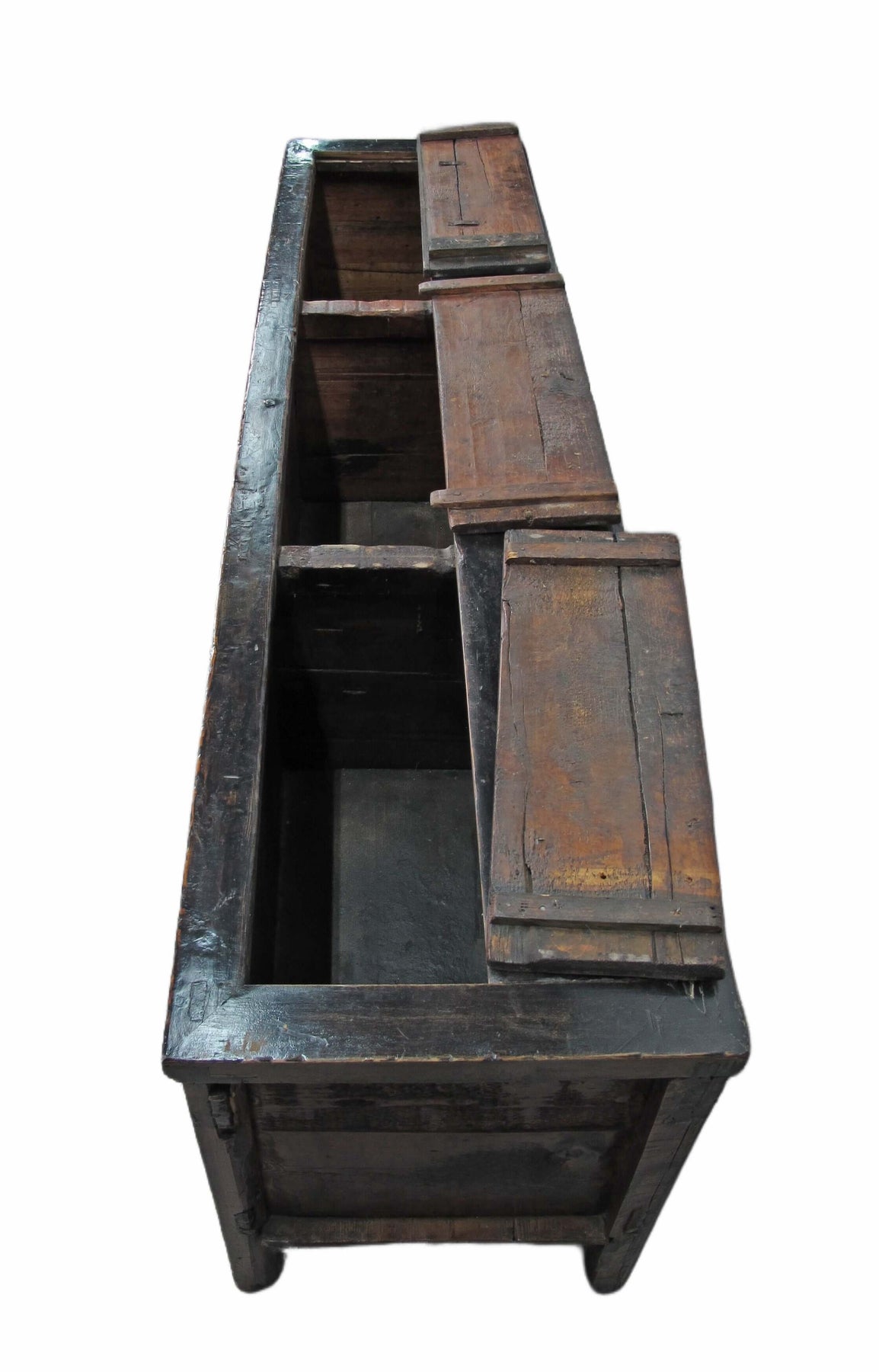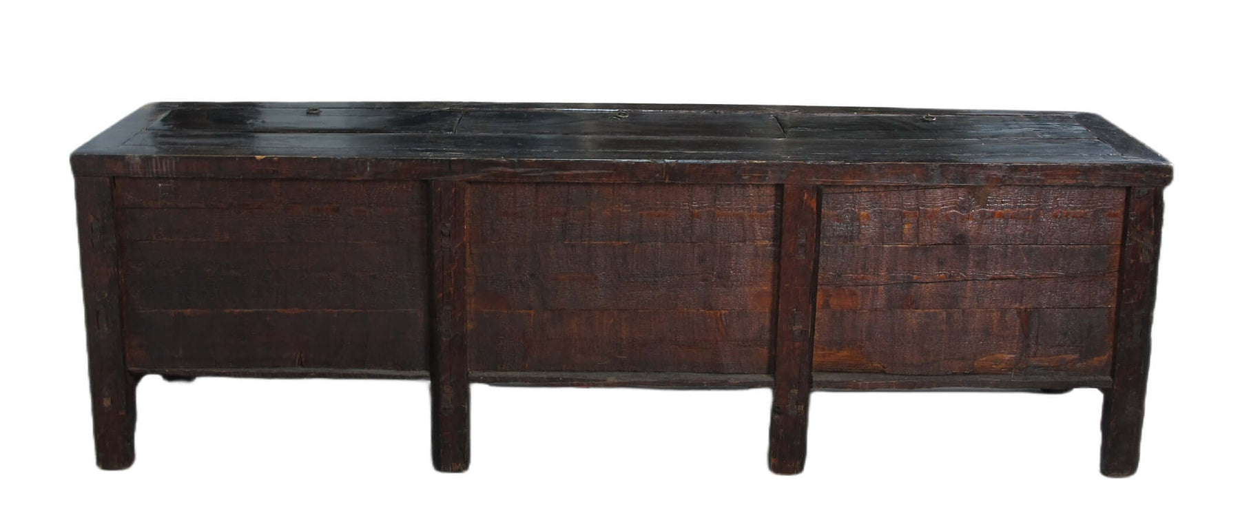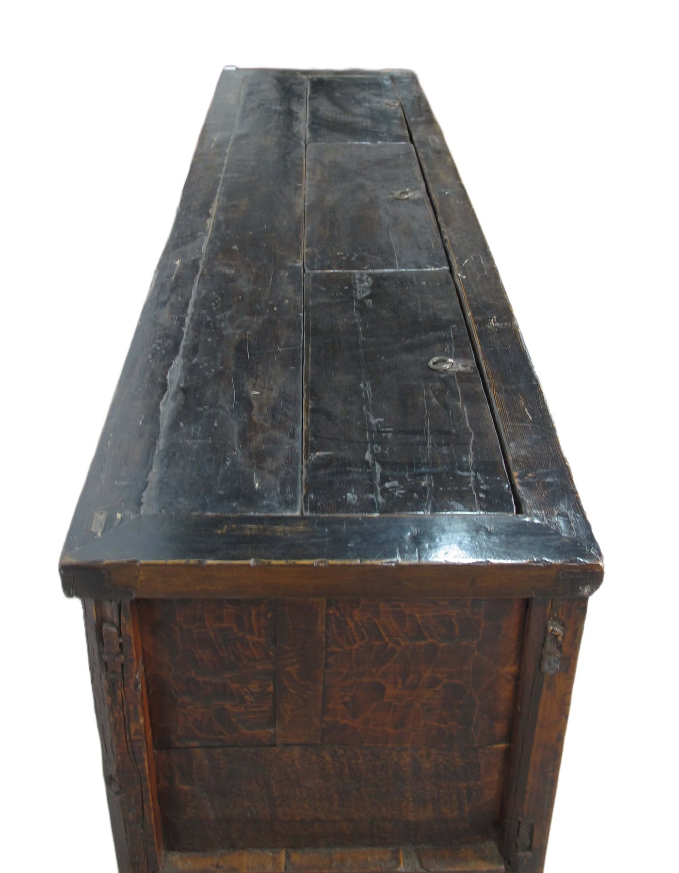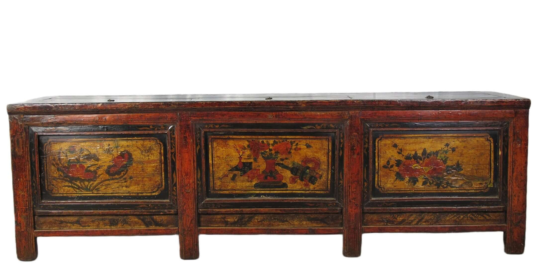 This hand painted antique Chinese trunk sideboard was used to store bedding and linen in the old time. There are 3 compartments that can only be accessed from the top.  With its rich patina, texture, and colors, this antique Asia sideboard cabinet will not only be an unique sideboard for TV, books, or objects in living or bed room, but also sofa back cabinet, hall way cabinet or bedding and towel storage cabinet in bathroom.