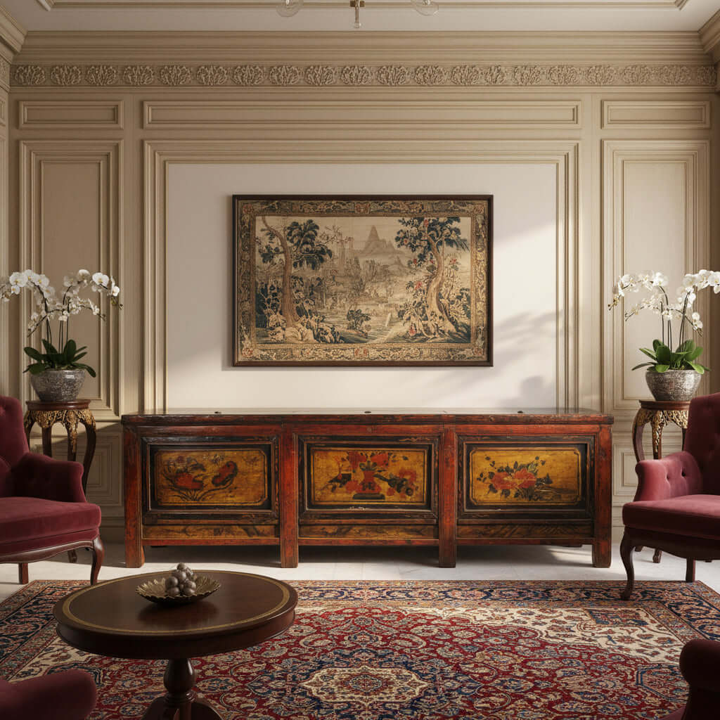 Hand Painted 85" Long Antique Chinese Sideboard