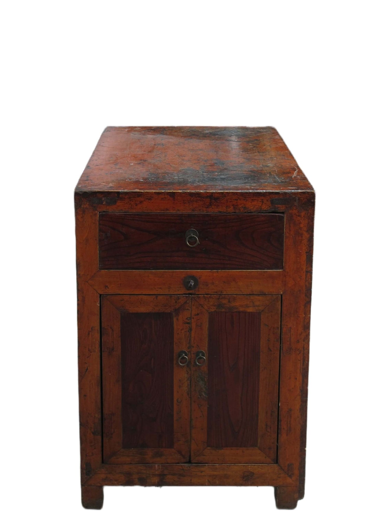 The front of this antique cabinet is decorated with hand painted flower wreath in the center surrounded by 5 bats  and decorative patterns around. With its delightful patina and rich colorful texture, this antique cabinet will be a splendid cabinet table in hall way, entry way, stairway.  There is 1 drawer and cabinet at each end.