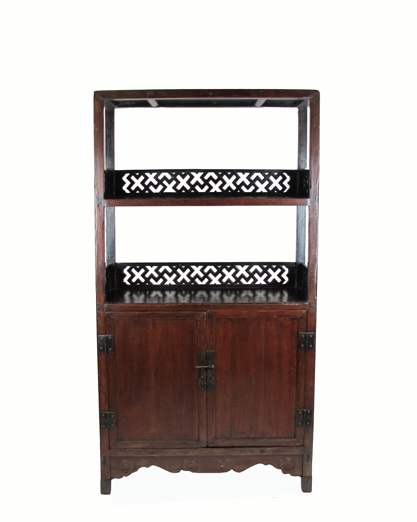 This antique Chinese cabinet features intricately carved lattice railings and hand-forged brass hardware. Its dark brown finish and four spacious shelves provide elegant storage and display options. Two cabinet doors offer extra space, making it ideal for showcasing china, porcelain, crystal, or books in your study or bedroom.