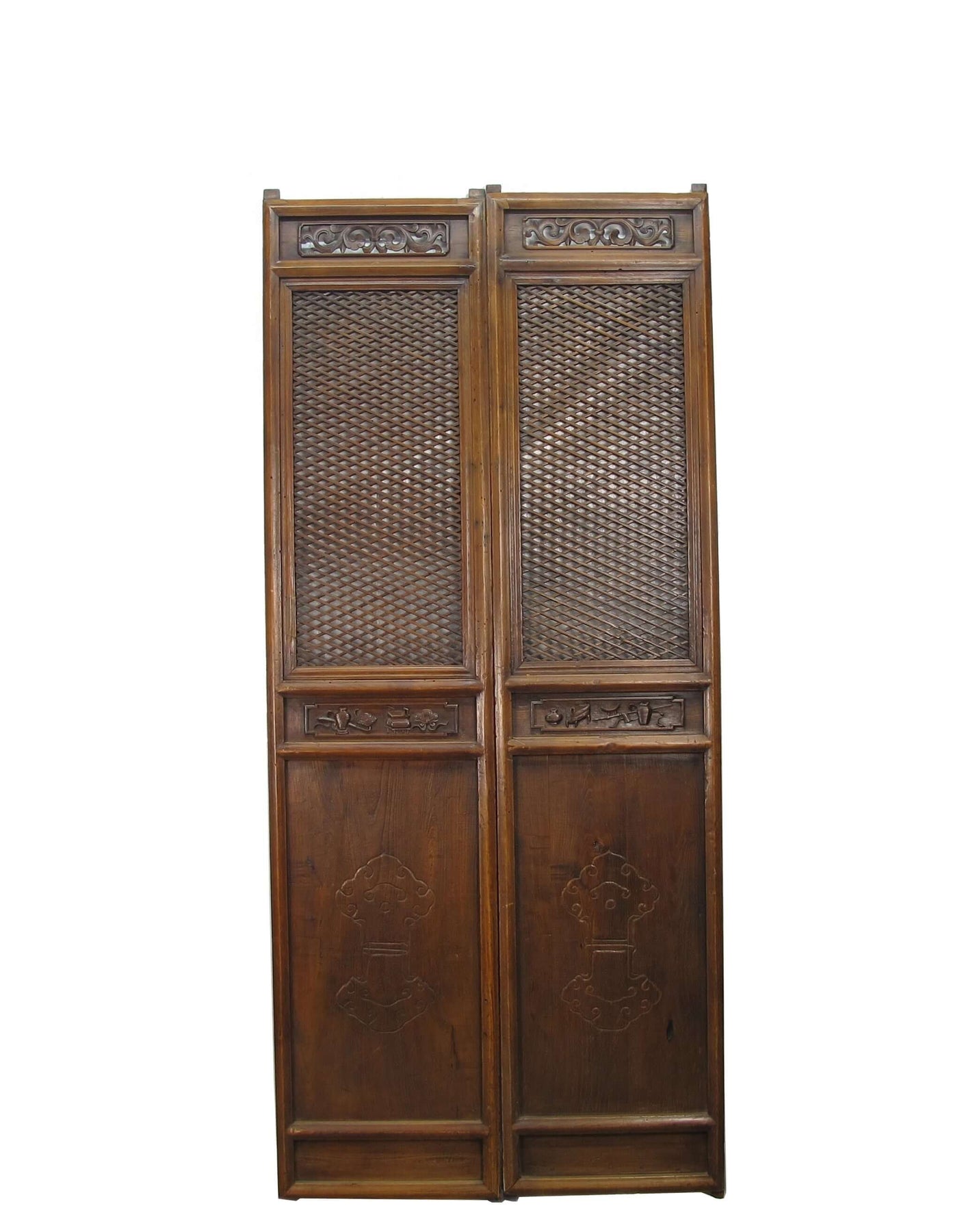 This pair antique Chinese screen door panels showcase hand made intricately designed lattice patterns. Each lattice panel was tenor and mortise interlocked to allow air to circulate nicely, and sun shines through to creates a mesmerizing visual effect. With their intricate latticework and fine craftsmanship, these screen door panels are a true testament to the superb skill of traditional Chinese artisans.  This 2 panel screen set can be used as room divider, screen doors, or a set of wall arts in living room or hall way and will last for generations to admire.  These exquisite panels add warmth and elegance to any space. Measuring 22 inches in width, 3 inches in depth, and an impressive 105 inches in height, these panels are sure to make a statement in any room.