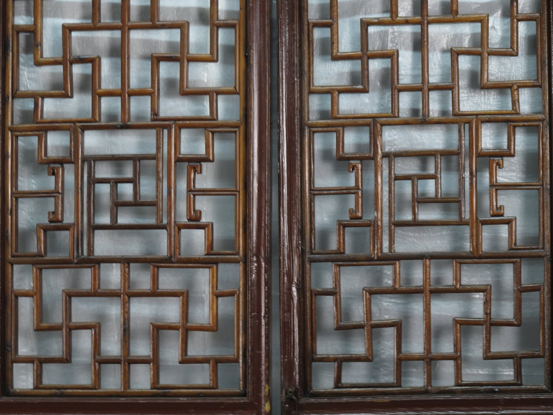 This pair antique Chinese screen door panels showcase hand made intricately designed lattice patterns. Each lattice panel was tenor and mortise interlocked to allow air to circulate nicely, and sun shines through to creates a mesmerizing visual effect. With their intricate latticework and fine craftsmanship, these screen door panels are a true testament to the superb skill of traditional Chinese artisans.  This 2 panel screen set can be used as room divider, screen doors, or a set of wall arts in living room or hall way and will last for generations to admire.  These exquisite panels add warmth and elegance to any space. Measuring 21.5 inches in width, 4 inches in depth, and an impressive 111 inches in height, these panels are sure to make a statement in any room.