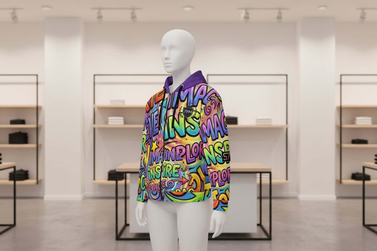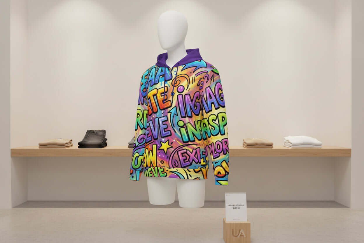 A bold expression of color and meaning, this purple-based multicolor hoodie features an all-over print of inspirational words designed to energize thought and self-expression. Crafted for comfort with a relaxed silhouette, it blends streetwear attitude with an intentional message. Each word tells a story—of focus, ambition, resilience, and creativity—making this piece as personal as it is visually striking.