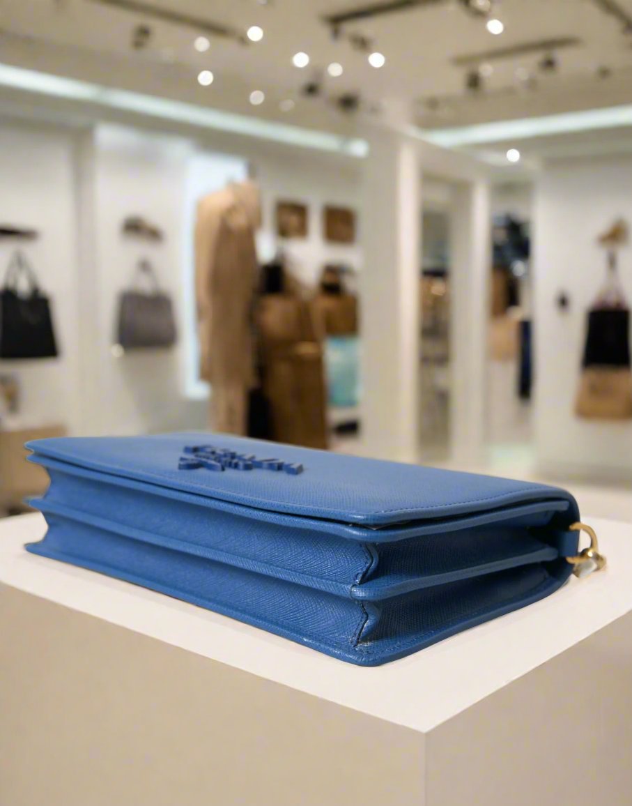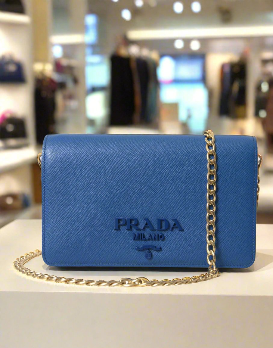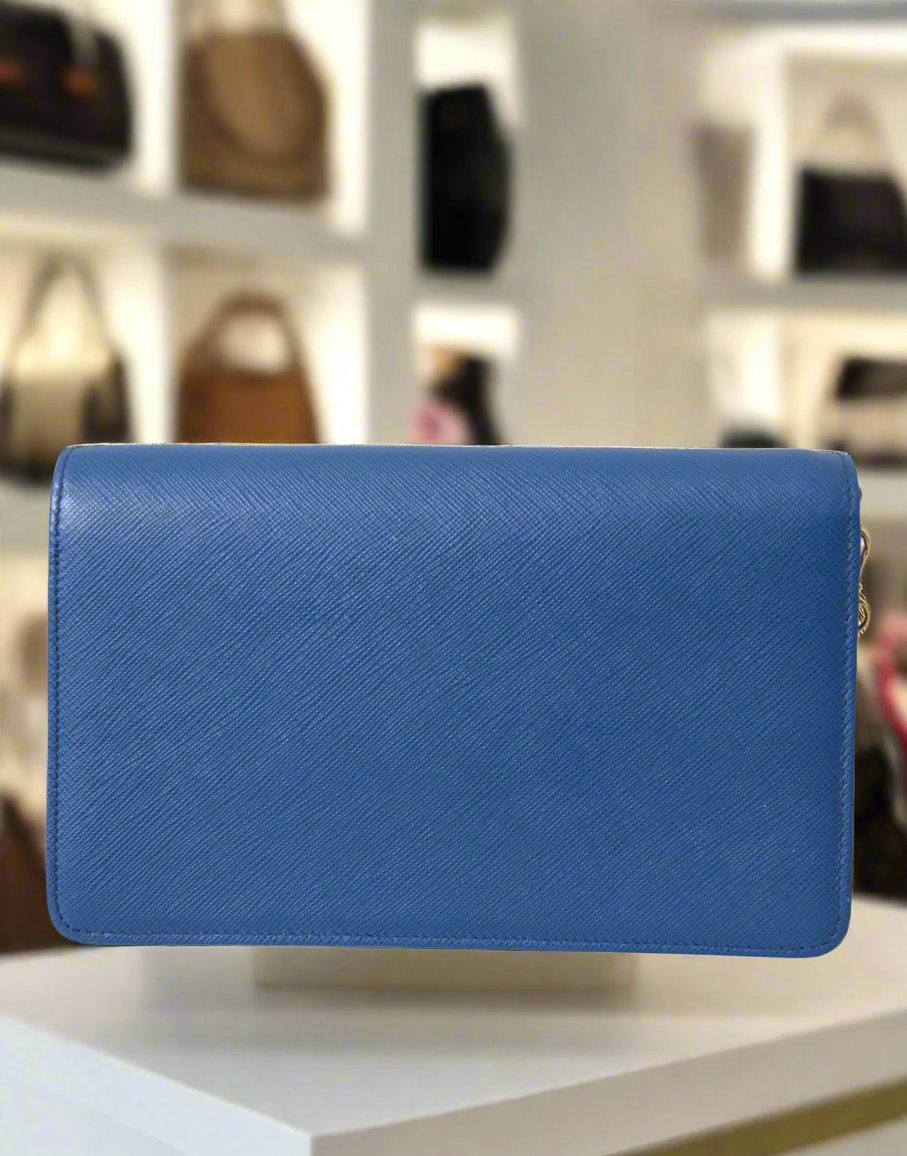 The PRADA Elegant Monogram royal blue Leather Sling Purse is the perfect blend of luxury and functionality. Made from premium leather, this purse features a sleek monogram design and a gold shoulder carry chain for a touch of elegance. Its versatile sling design makes it ideal for any occasion, providing both style and convenience.