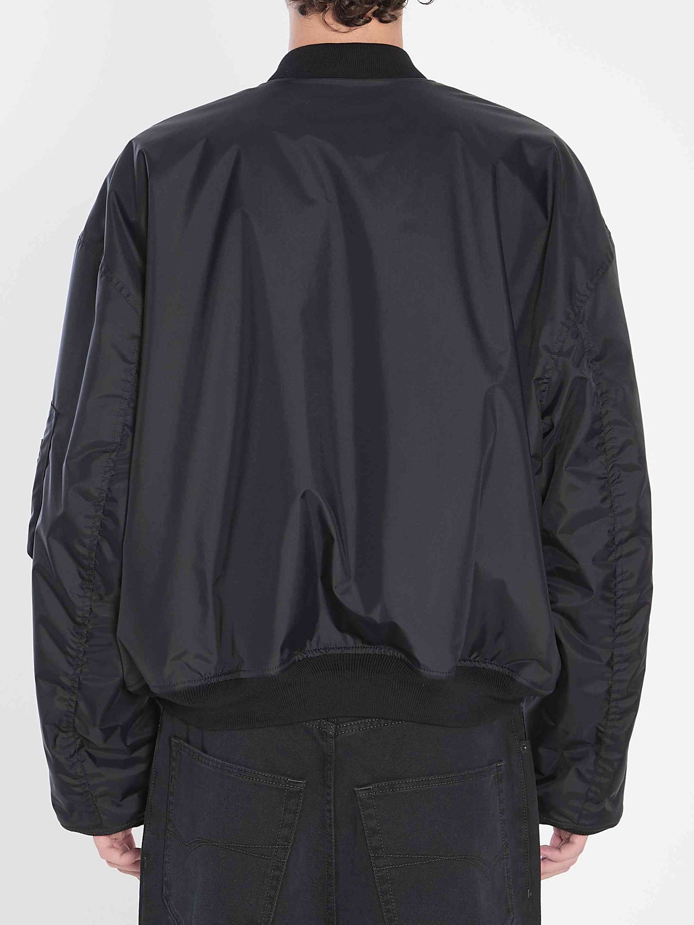 Black polyamide bomber jacket. Features a zip closure with a pull tab, two flap pockets with snap buttons on the front, a zip pocket on the left sleeve, ribbed trims, and a uniform patch on the chest. Oversize fit.