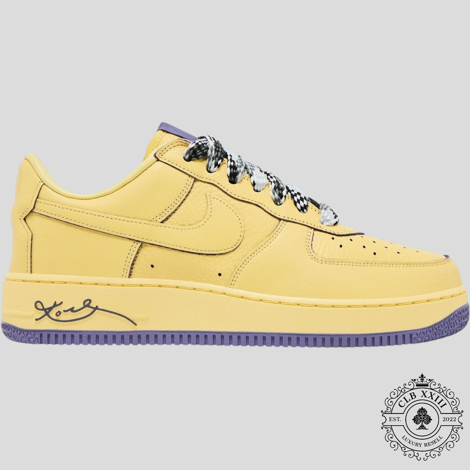 Inspired by Kobe Bryant’s iconic practice look, this Nike Air Force 1 Low Protro features premium Soft Yellow leather, Dusty Amethyst accents, and knit laces matching his famous pajamas. It includes unique Sheath logos on the outsole and etched details honoring Kobe’s five championships. Enhanced with React foam and Nike Air cushioning, it delivers exceptional comfort and style that celebrates a legendary moment.